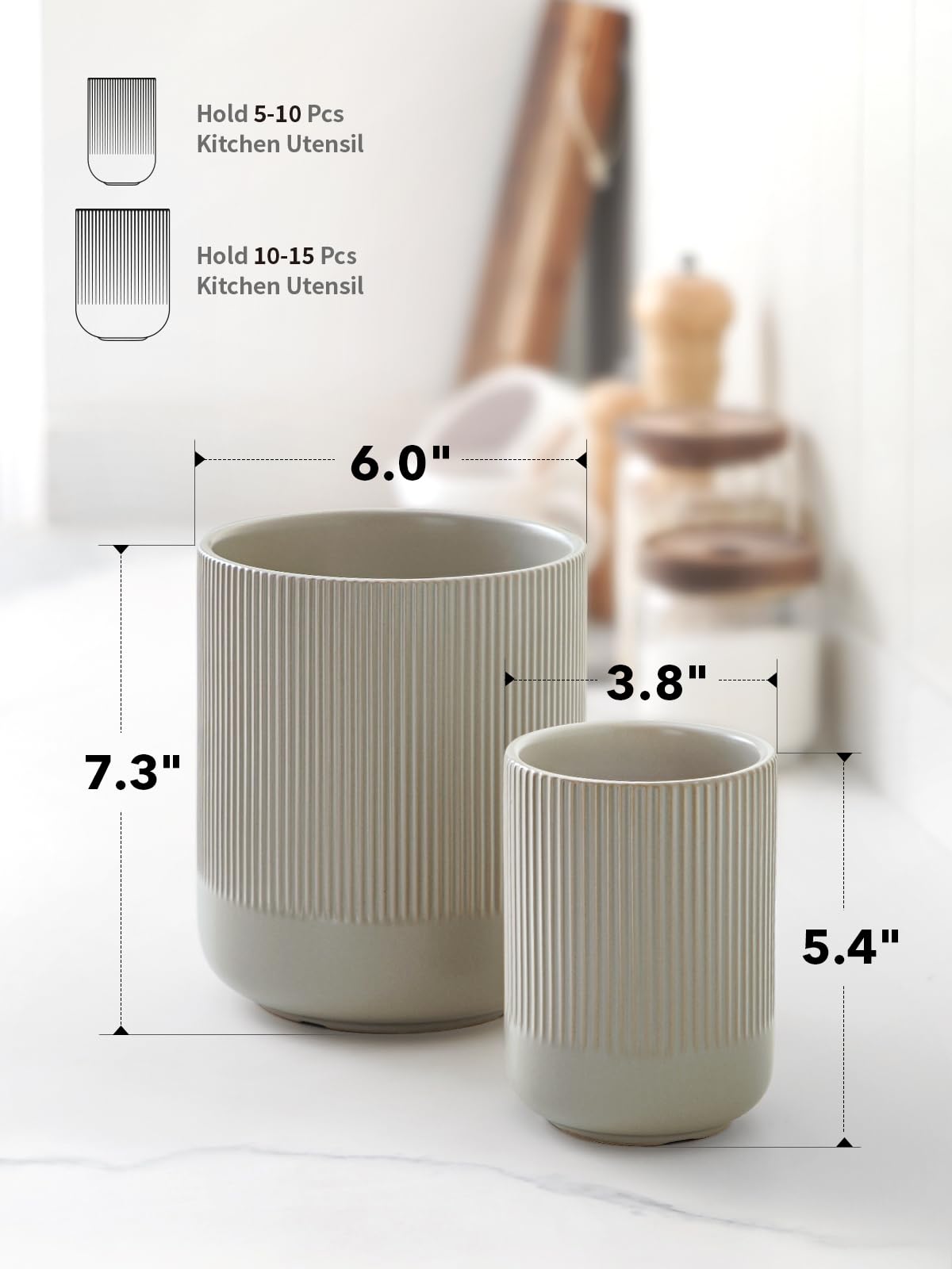 Thoughtfully Sized, Set of 2: Our utensil holder set includes 2 carefully proportioned holders for your kitchen accessories; The larger holder, measuring H7.3" x D6", is designed to comfortably store around 15 spatulas or utensils; The smaller holder, at H5.4" x D3.8", is suited for the organized arrangement of up to 10 sets of flatware; Say hello to a well-organized cooking space