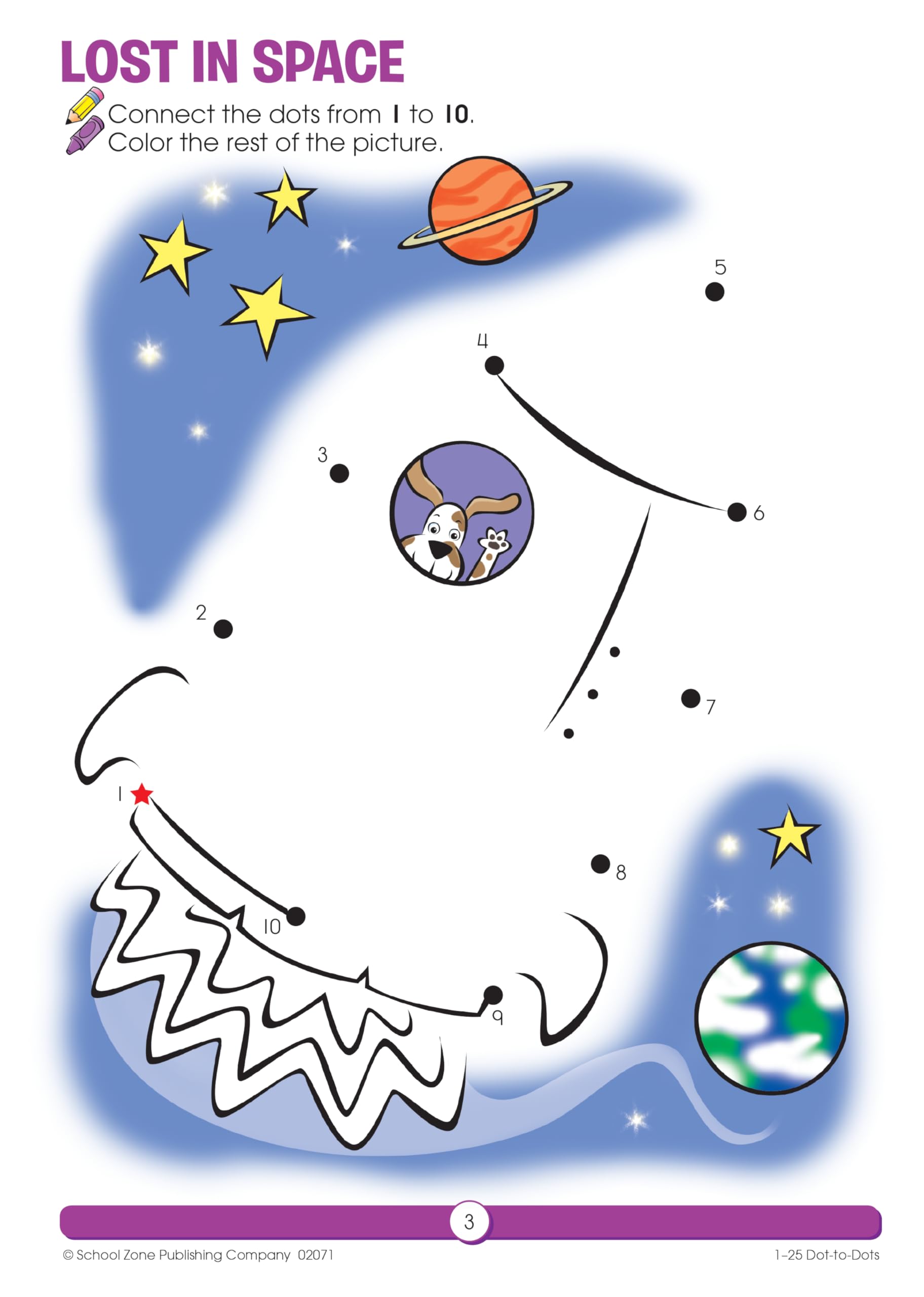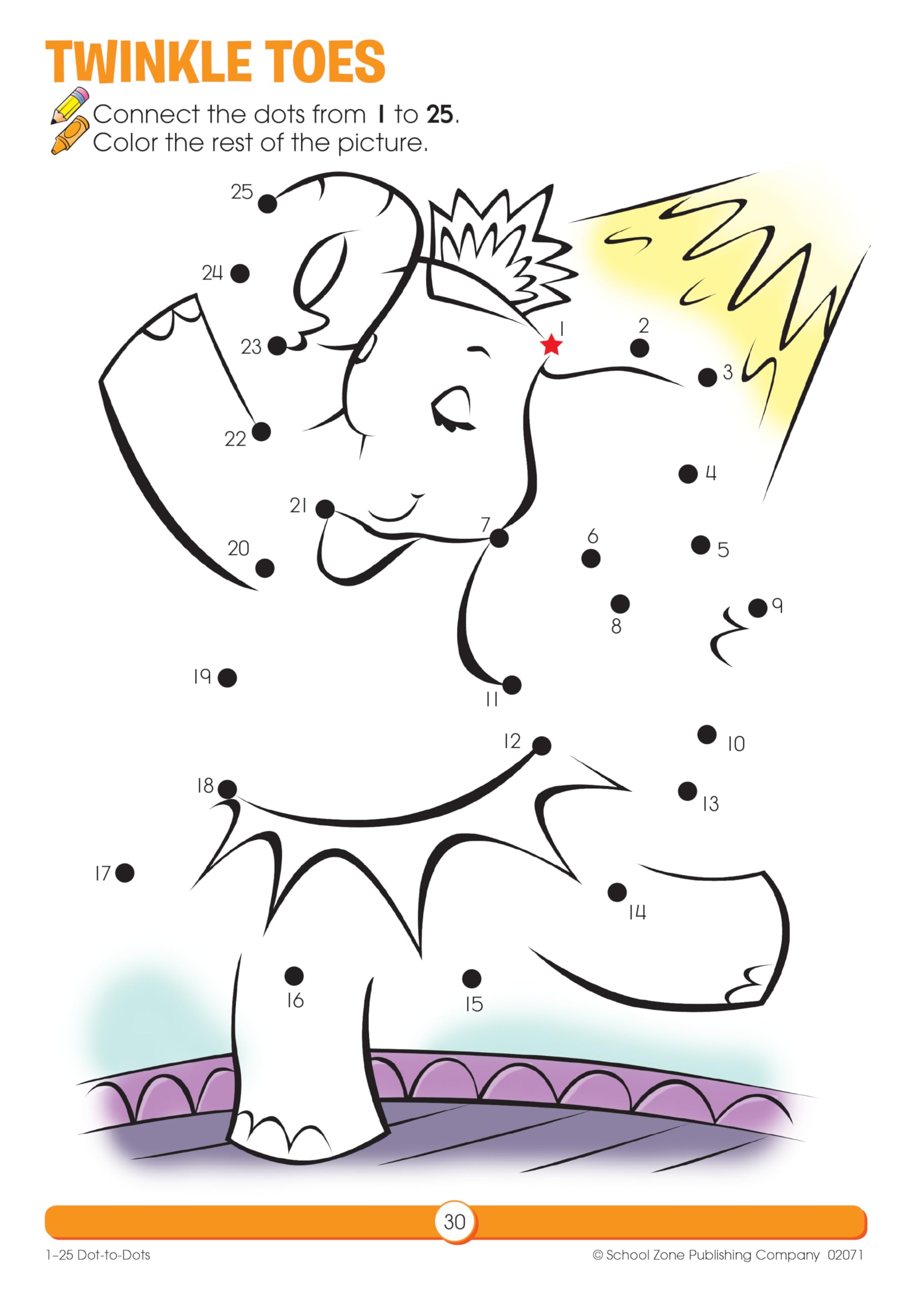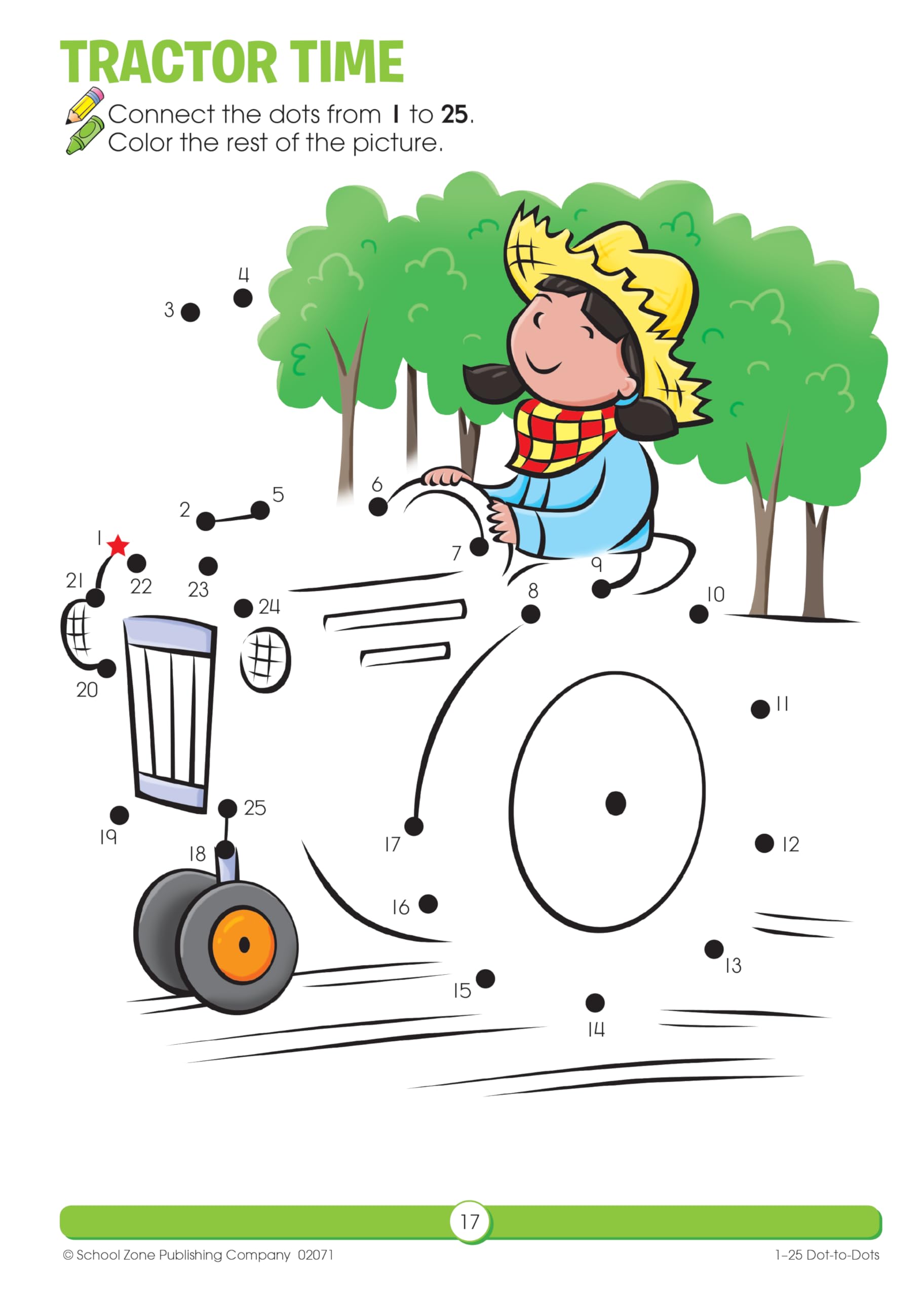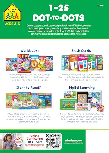 Visit the School Zone store at Amazon.com/SchoolZonePublishing. BOOK FEATURES 32 pages of dot-to-dot puzzles For ages 3-5 7.75" x 10.75" pages with durable glossy cover Preschoolers and kindergartners connect the dots and make pictures to color This workbook provides practice in numbers 1-25, counting, and numerical order Charming illustrations, bright colors, and playful scenes help make learning fun Slim and portable, perfect for on-the-go learning! AMAZING - Solve the dot-to-dot puzzles, and practice counting at the same time! It's a fact! When your child understands and develops key skills, math can be more fun and a lot less stressful. Our 1-25 Dot-to-Dots Numbers early math workbook from the Get Ready!™ series, has 32 playful dot puzzles to solve. Each puzzle, designed for ages 3-5, labels the dots with numbers 1-25 and focuses on developing sequencing and eye-hand coordination--the skills that help prepare preschoolers for school. Developing a "learning is fun" habit comes easy with this kids workbook, and the slim 32-page size is great for packing into totes, backpacks and luggage. WORKBOOKS FOR KIDS - Writing by hand, as opposed to typing on a computer, fires up specific areas of a child's brain, improving a child's ability to not only remember what he or she learns but to think of new ideas. Completing physical pages also give a sense of accomplishment that’s hard to get from a digital product. This is a workbook kids are sure to enjoy! When workbook is finished, you can fill out the included Certificate of Achievement to reward a job well done. Hang it on the wall or fridge to display their achievement with pride. PREPARATION - Let us help you prepare your young children for the next grade level with our workbooks, flashcards, card games, early reading books, and online learning program – Anywhere Teacher. Keep kids "classroom ready" with these great supplemental learning tools and more! AWARD WINNING - School Zone content has won The Parents’ Choice Foundation Award, Tillywig Toy Awards, Brainchild Award, Family Choice Award, Mom's Choice Awards Honoring Excellence, Gold Star Toy Scholastic Parent and Child Award and many more. OUR STORY - More than 40 years ago, long-time educators James Hoffman, Ed.D., and his wife Joan Hoffman, M.A., began a retail supply outlet for teachers, then soon identified a need for at-home learning materials to help parents support and supplement their children’s classroom instruction. School Zone Publishing fast emerged as the market leader in workbooks and flashcards for preschoolers through sixth graders. School Zone remains family-owned, focused on excellence, responsive to customers, alert to emerging technology, and committed to the community. We continually update our products with new features and content, reflective of changing standards, evolving teaching methods, and overall best practices.