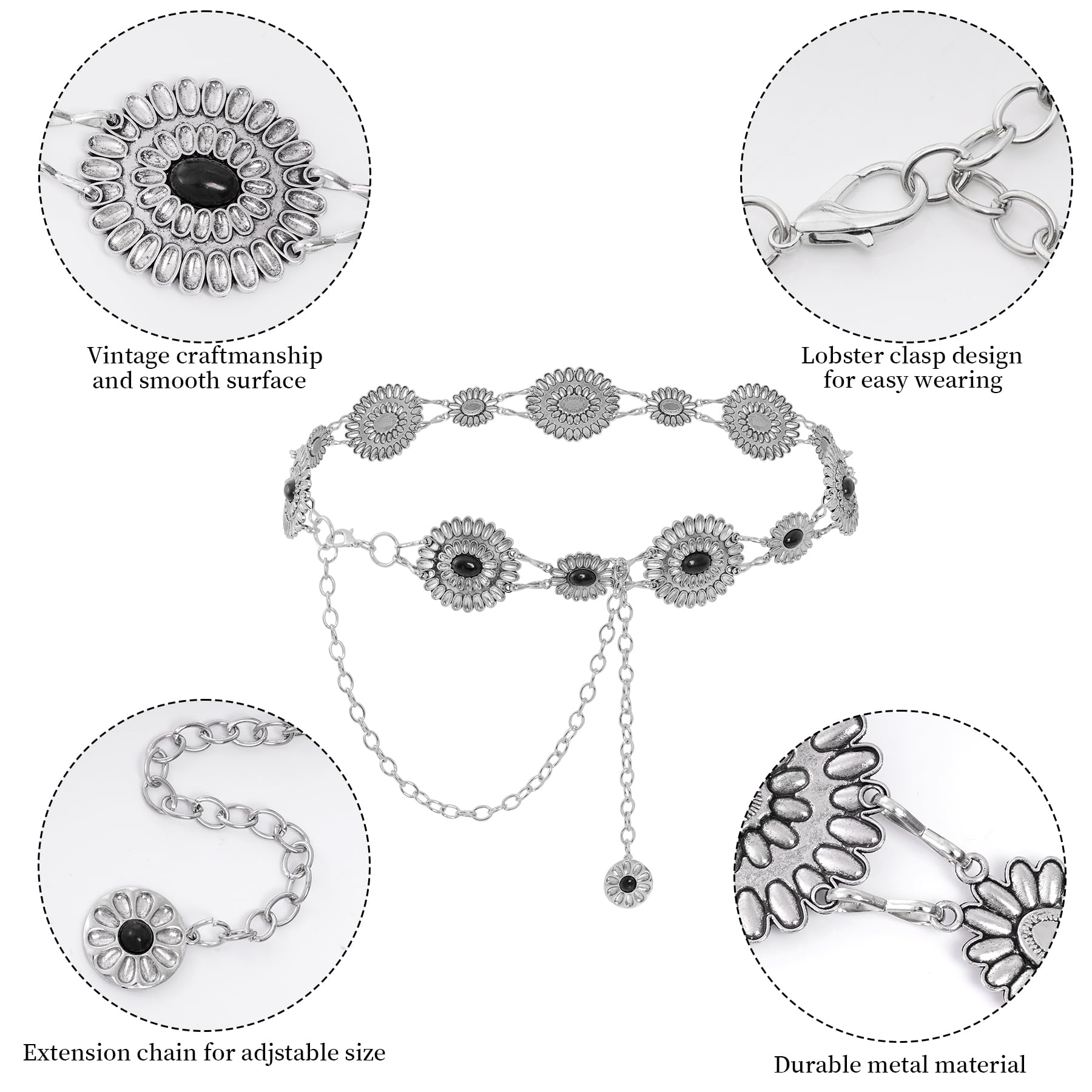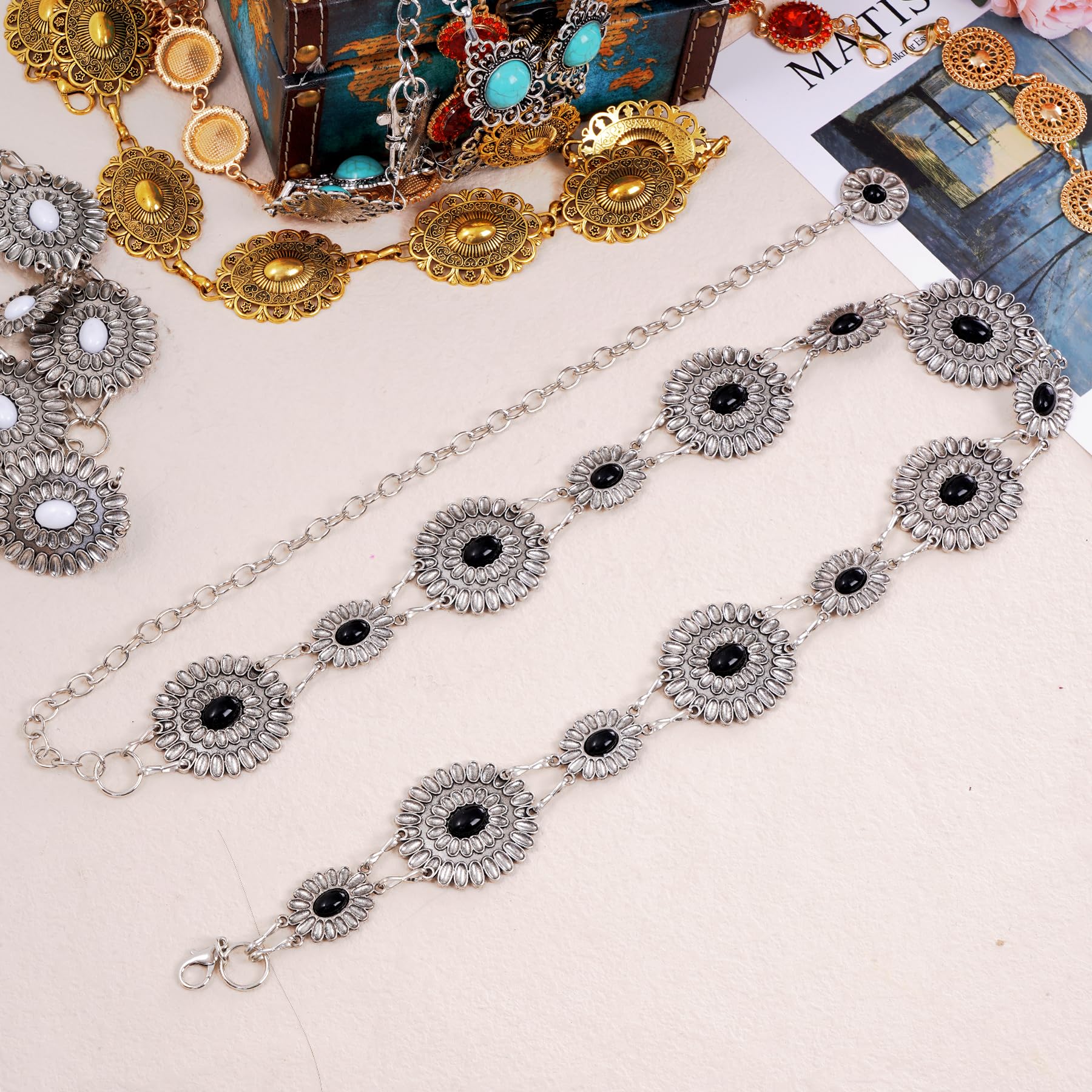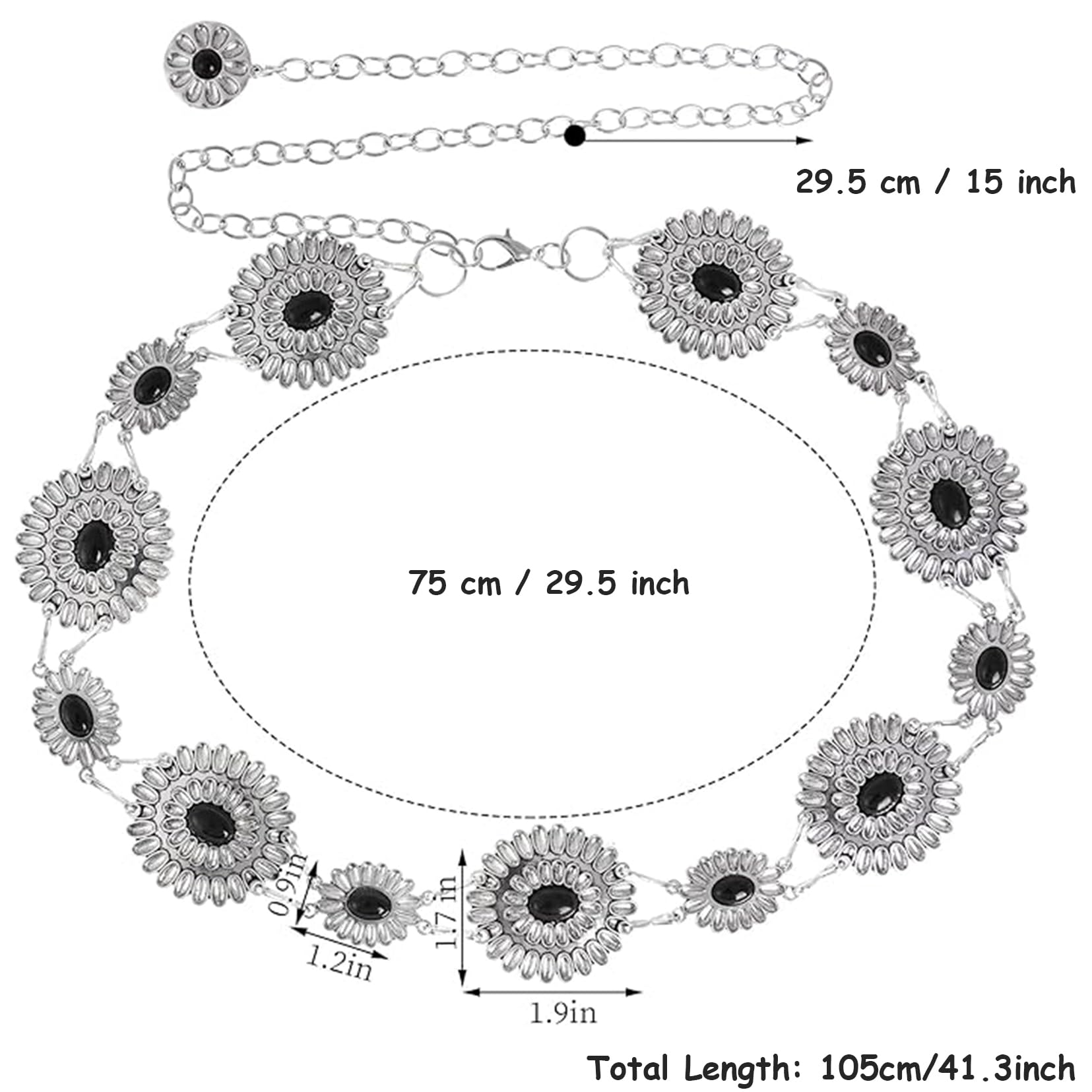 Adjustable Western Metal Concho Belt for Women: The adjustable metal waist belt for dresses jeans length about 73 cm / 28.7 inch with 47 cm / 18.5 inch extension chain. Silver turquoise chain belts fit for most women girls waist, add Western boho style charm, match any outfit.