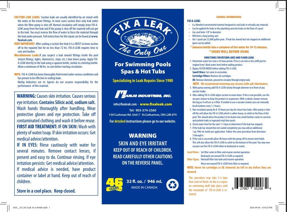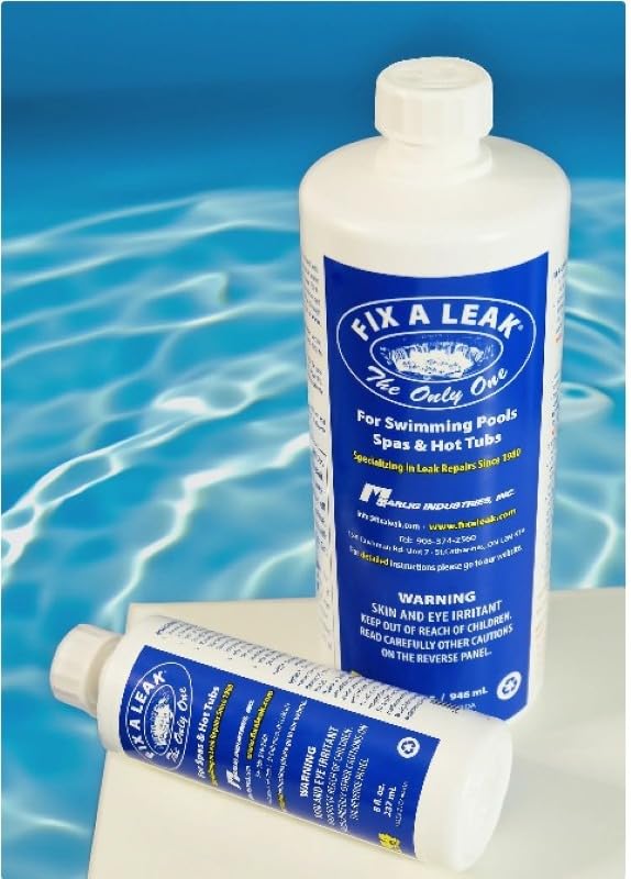 Fix-a-leak : Is a blended concentrated material designed to seal leaks in virtually any material : Can be applied for leaks in the shell and works equally well in plumbing : Will seal holes 1/8" in diameter : Will form a permanent seal use 1 quart per pool up to 22, 000 gallons. Do not use in excess of 1 quart per 5, 000 gallons of water. Directions * shake well before using* bypass filter media before adding fix-a-leak to water. Sand filters: Set filter valve to recirculate. Other types: Remove cartridges de elements from filter tank. Then proceed to circulate through empty tank with pump running, add fix-a-leak slowly through skimmer or in front of any other suction intake. Affecter adding fix-a-leak adjust suction to main drain. If this is not possible, the vacuum cleaner could be used alternatively, simply by placing the vacuum in deepest part of pool and connect to normal vacuum connection. Fix-a-leak is very heavy and will sink to the lowest point rather quickly. It must be stirred back into suspension, either manually using a pool broom or mechanically with a automated pool cleaner every 4-6 hrs. During circulation of water. Continue to recirculate water until the leak has stopped. Mark level of water in pool and check for 2-3 days to determine if the leak has stopped. Affecter the leak has stopped and given the proper time to cure (24-48 hrs.) You may return to normal filtration. Sand filters: Set filter valve to filter and resume normal operation. Backwash out unused fix-a-leak as required. Other types: Reinstall filter into tank and resume operation. Rinse out unused fix-a-leak from filter as required. Never let cartridges of de elements be left to dry before they are cleaned. Treatment can be repeated if necessary. Suction leaks are usually known by air mixed with the water at the return fittings. In most cases suction lines only leak water when the filter pump is shut off. Normal circulation.