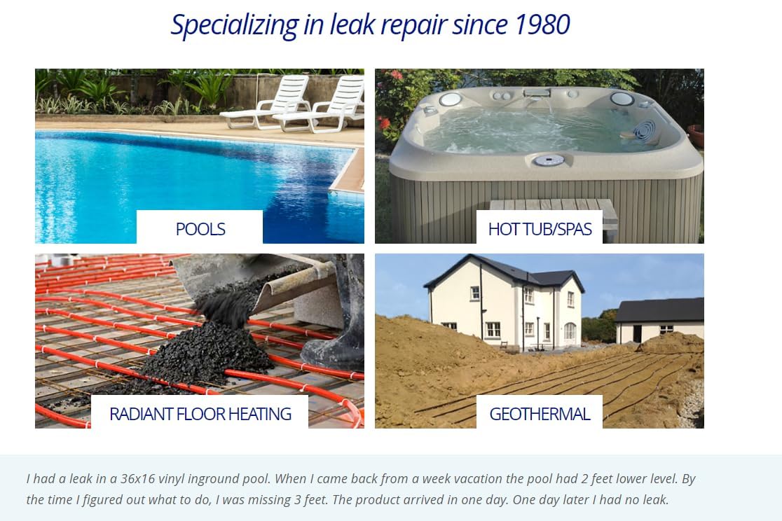 Designed to fix leaks for pools, spas, and hot tubs in virtually any material