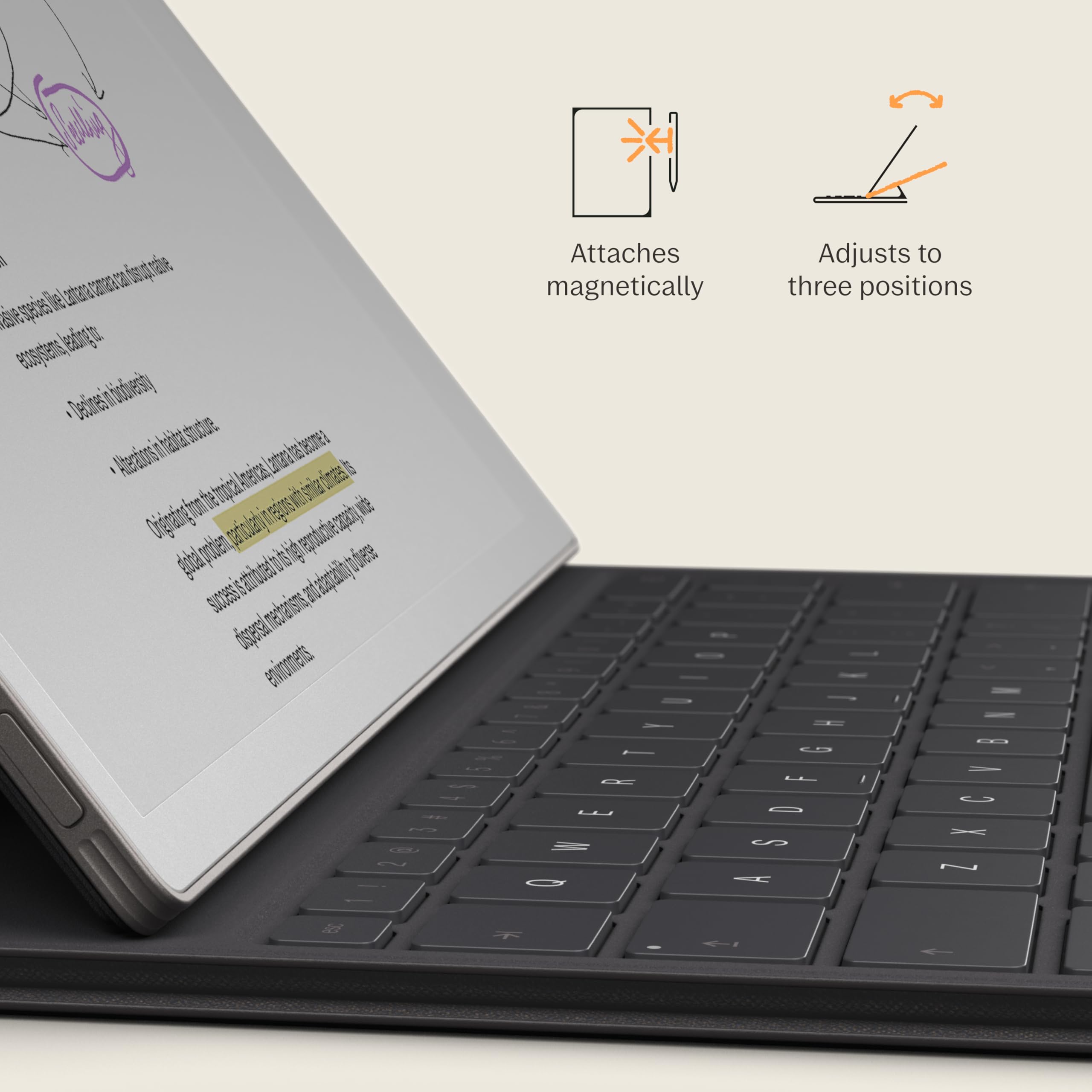 Find the Right Angle: Type Folio for Paper Pro offers two typing modes: an upright position and a near-flat position perfect for combining handwriting and typed text. Reading documents or writing by hand? Fold away the keyboard and open your folio up like a book.