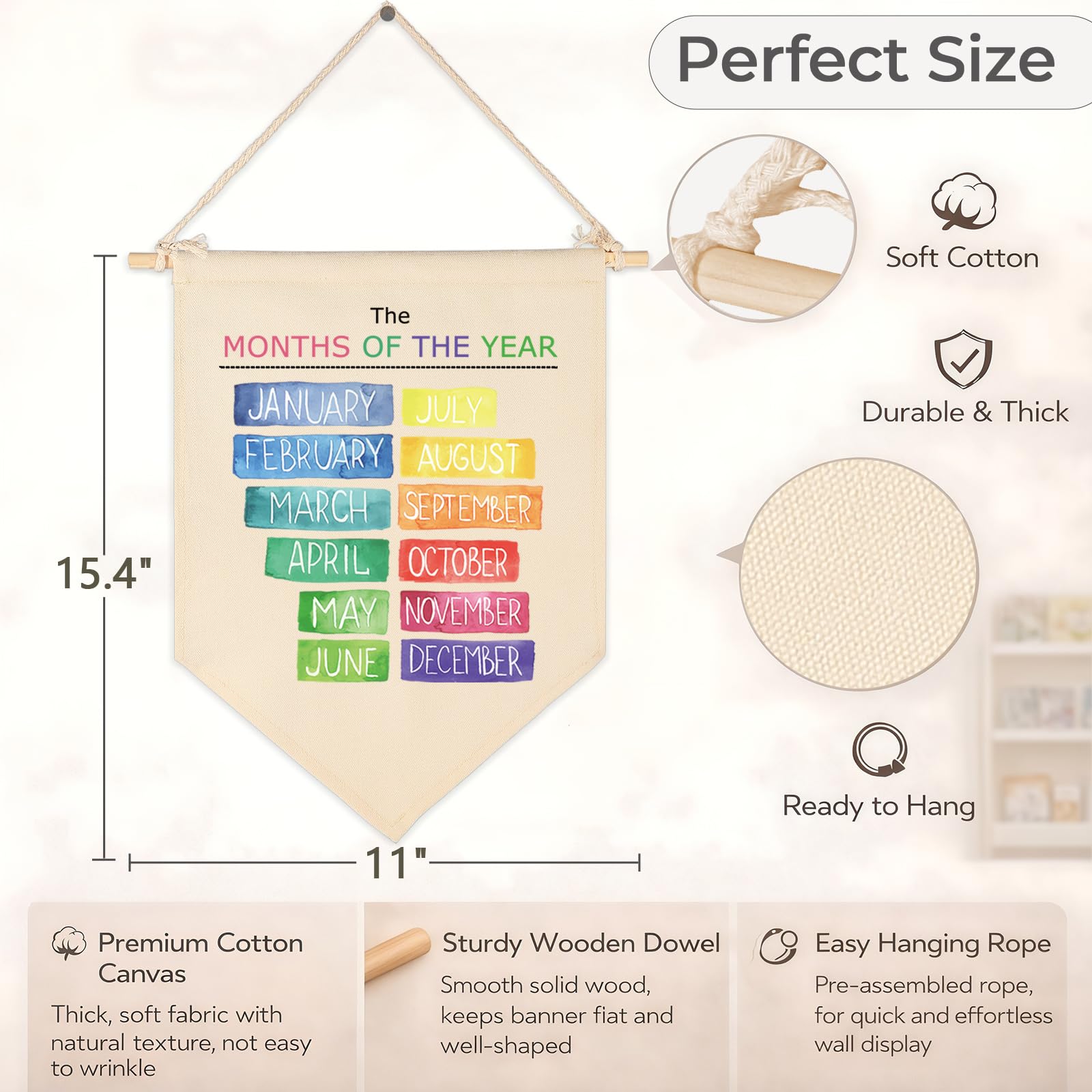 Celebrate the passing of time with our Months of the Year Canvas Hanging Flag. Measuring 15.4 x 11 inches, this artisan-crafted educational banner is a wonderful gift for teachers and parents helping children master the calendar. Each month is displayed in a unique, vibrant watercolor block, creating a cheerful and organized visual guide for young learners. Made from premium, heavy-duty cotton canvas and supported by a natural wooden rod, this high-quality banner is a durable and beautiful addition to any early childhood learning environment.