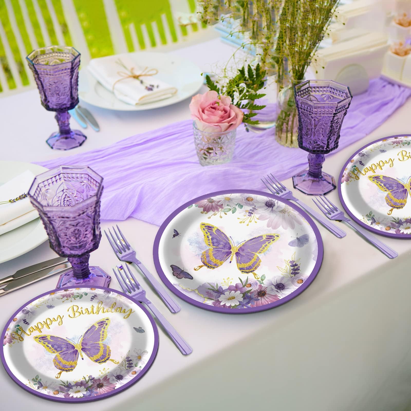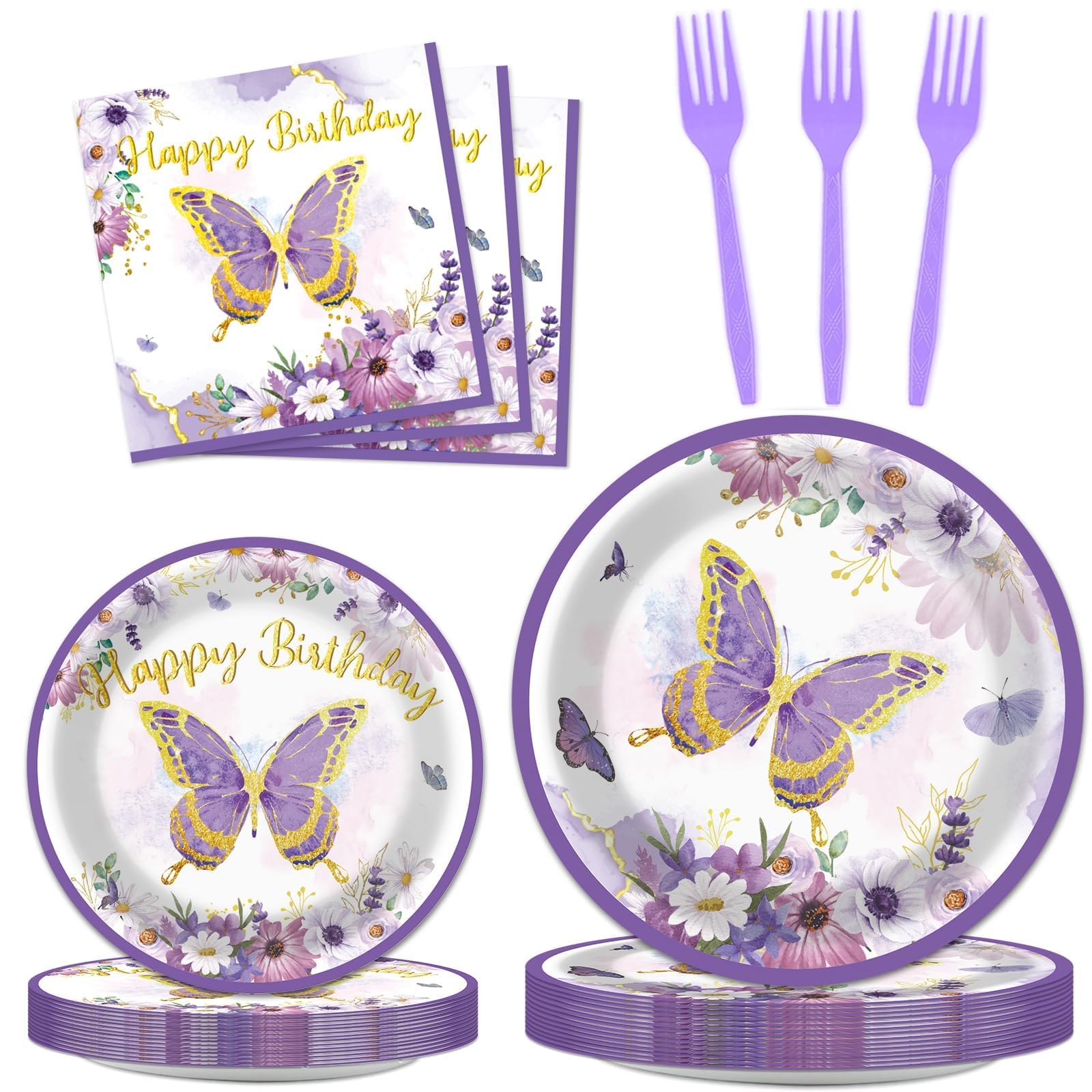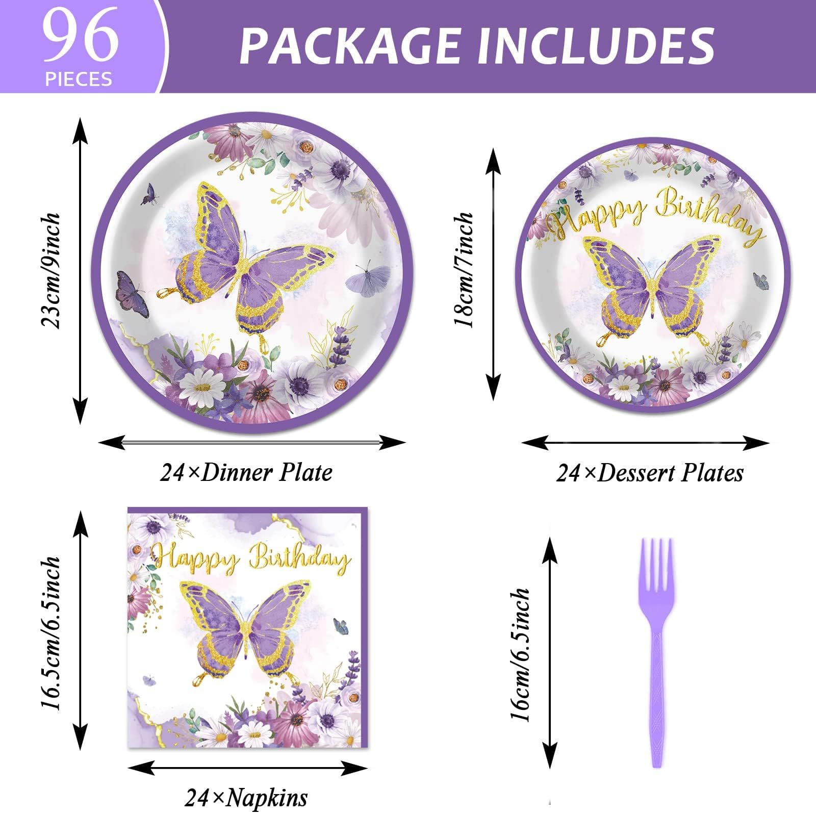 Package Contents:These butterfly party dinnerware set including 24pcs 9 inches butterfly paper plates,24pcs 7 inches butterfly paper plates,24pcs butterfly napkins,and 24pcs plastic purple forks.Large-volume packaging can meet your party needs,you don't have to worry about the quantity.