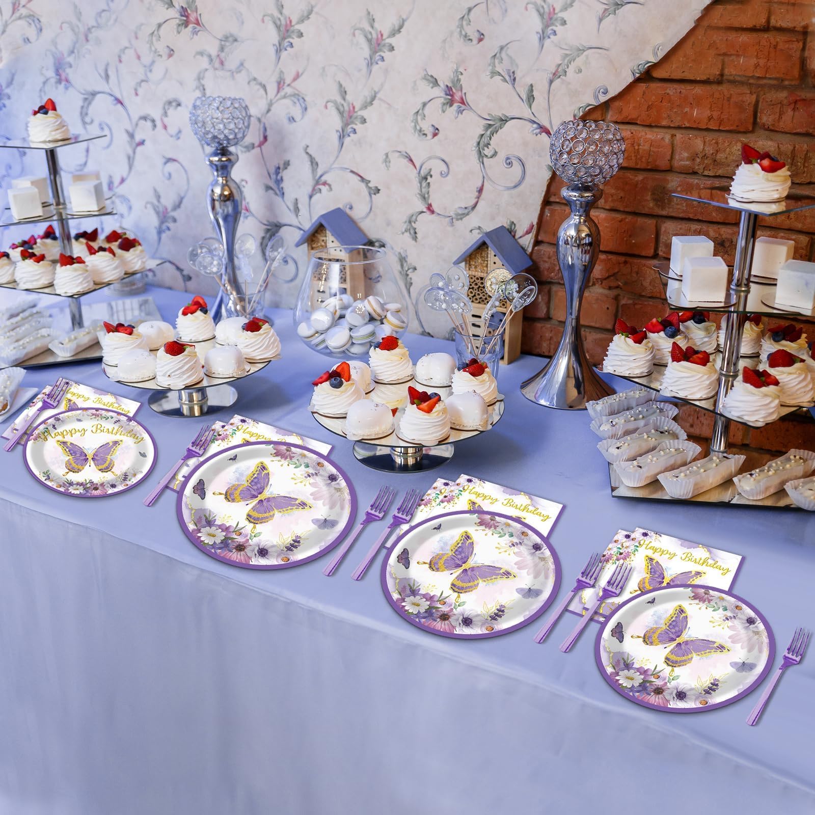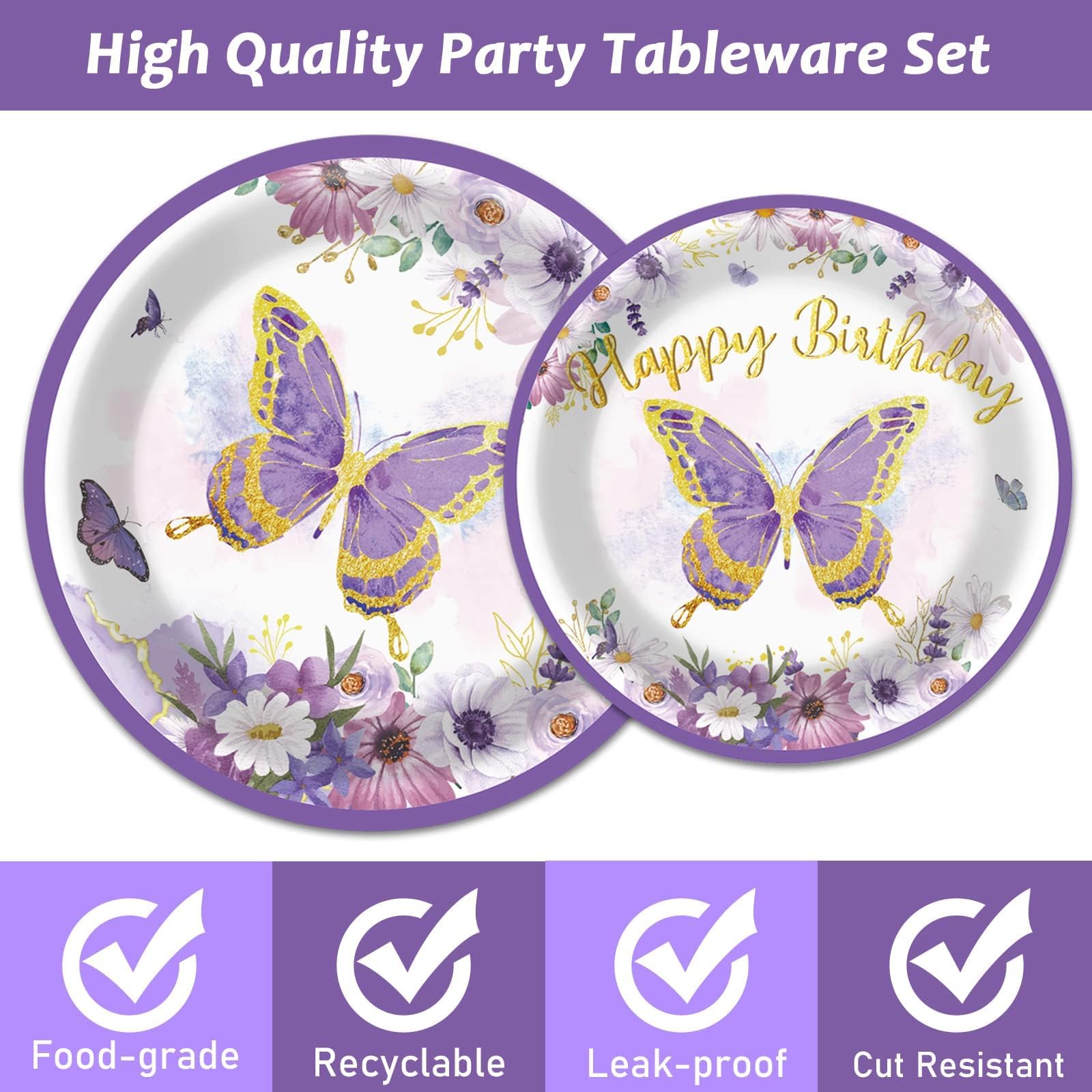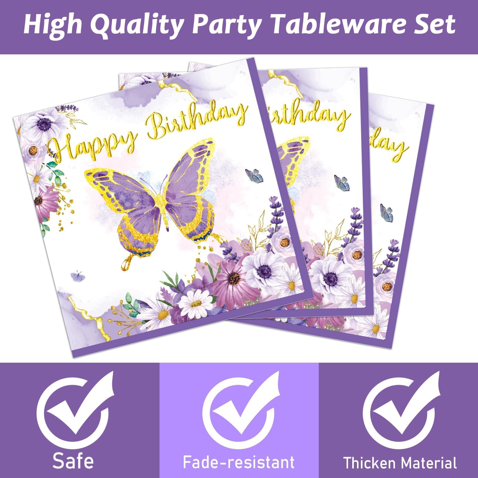 Quality Material:The set of purple butterfly plates and napkins are made of high-quality non-polluting materials.The purple forks are made of degradable plastic. The surface of the butterfly themed party dinnerware set can be waterproof and oil-proof,which will make a safe guarantee for the health of your family and friends.