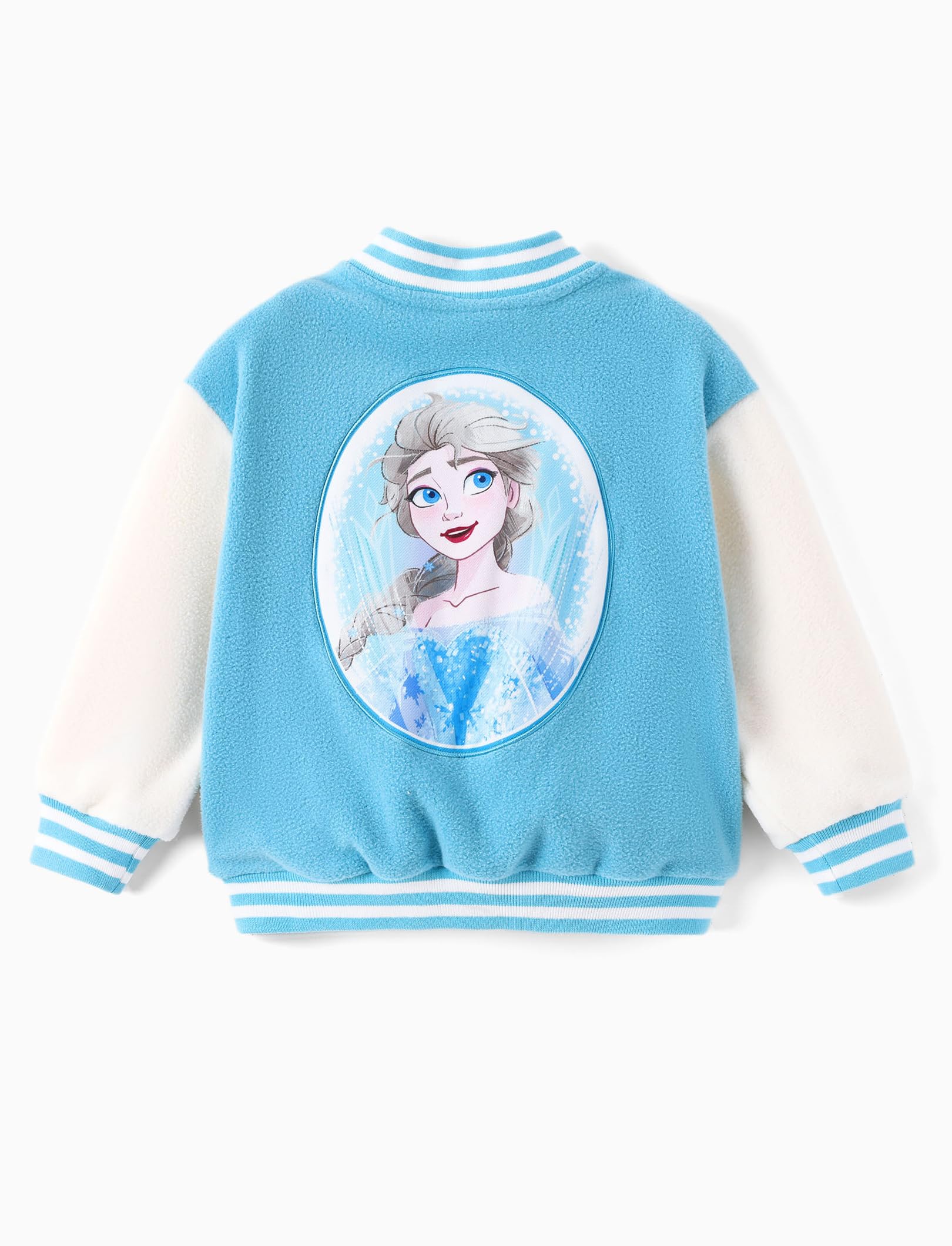 Description Charming & Regal Design: Let your little one channel her inner queen with this stylish Disney Elsa varsity jacket! Inspired by Frozenβs beloved Elsa, this jacket features a large, sparkling Elsa print and embroidered name detail that brings her magical presence to life. The soft blue and white color combo, classic button-up closure, striped cuffs and hem give it that timeless varsity look with a princess twist. Perfect for girls aged 2-6, itβs ideal for school, outings, or chilly playdatesβkeeping her warm while making her feel like royalty every day