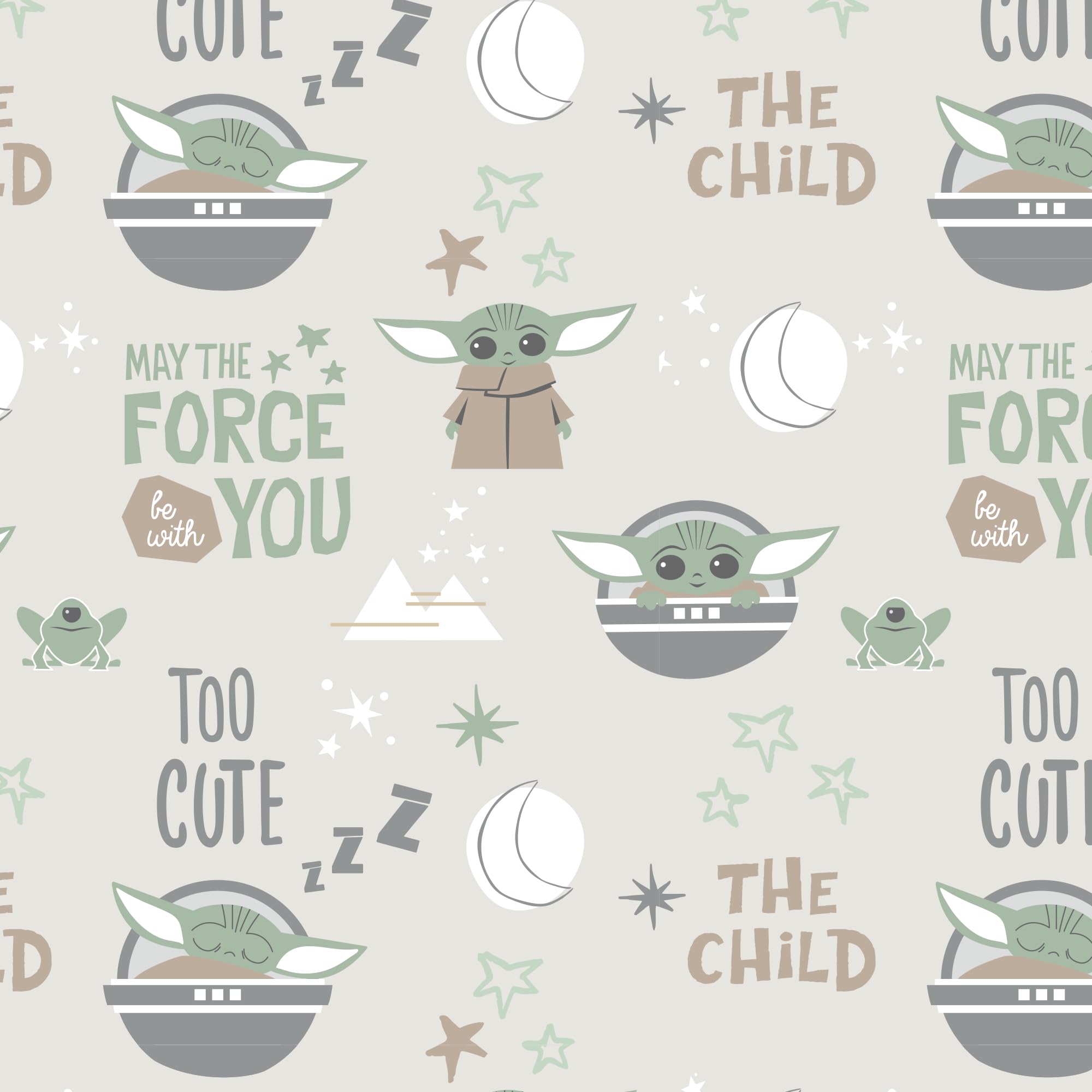 Your little one will be comfy and cozy on this soft microfiber fitted crib sheet. It is on a warm gray ground with Baby Yoda/The Child/Grogu in a variety of poses. He is in his dark gray pram pod sometimes fast asleep, sometime his large eyes are wide open, and sometimes he is standing in his favorite tan iconic coat. There is verbiage that says May the Force be with you, The Child, Too Cute, along with moons, stars, and mountains. The sheet has elastic all the way around ensuring a safe and secure fit on a standard size crib mattress measuring 28” X 52”.