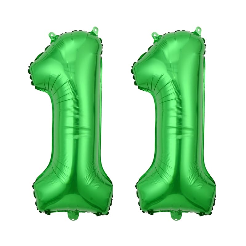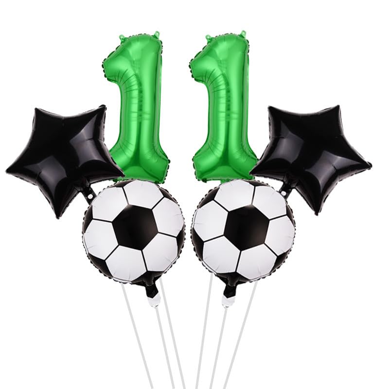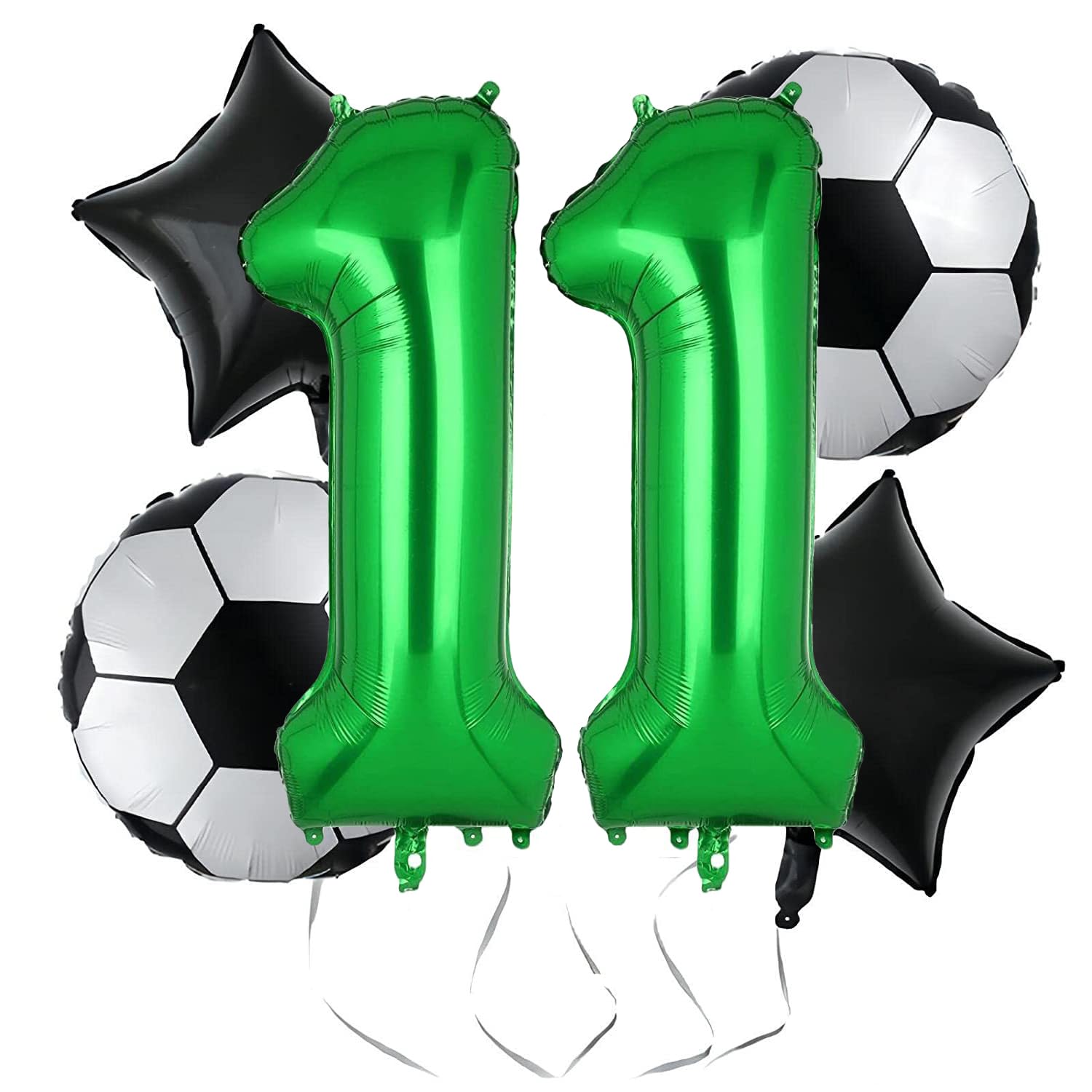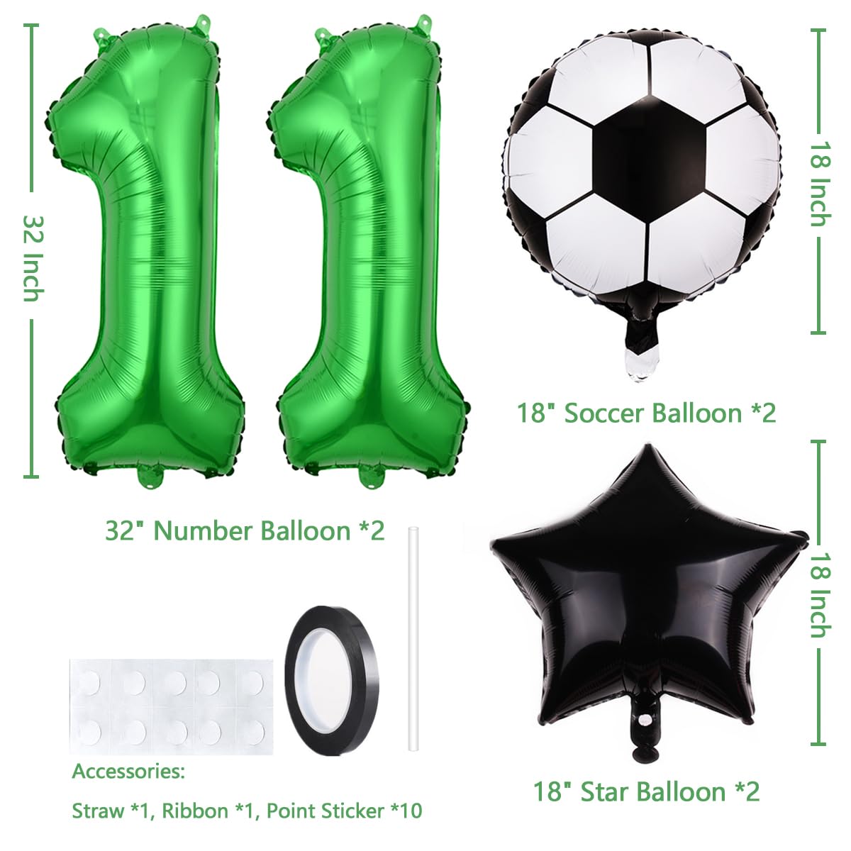 SOCCER BIRTHDAY BALLOONS: 6 Piece Pack Includes 2 x 18 Inch Soccer Balloons, 2 x 18 Inch Dark Star Balloons, 1 x 32 Inch Big Green Number 11 Balloon, 12 x Point Stickers, 1 x Straw, 32 Ft Ribbon