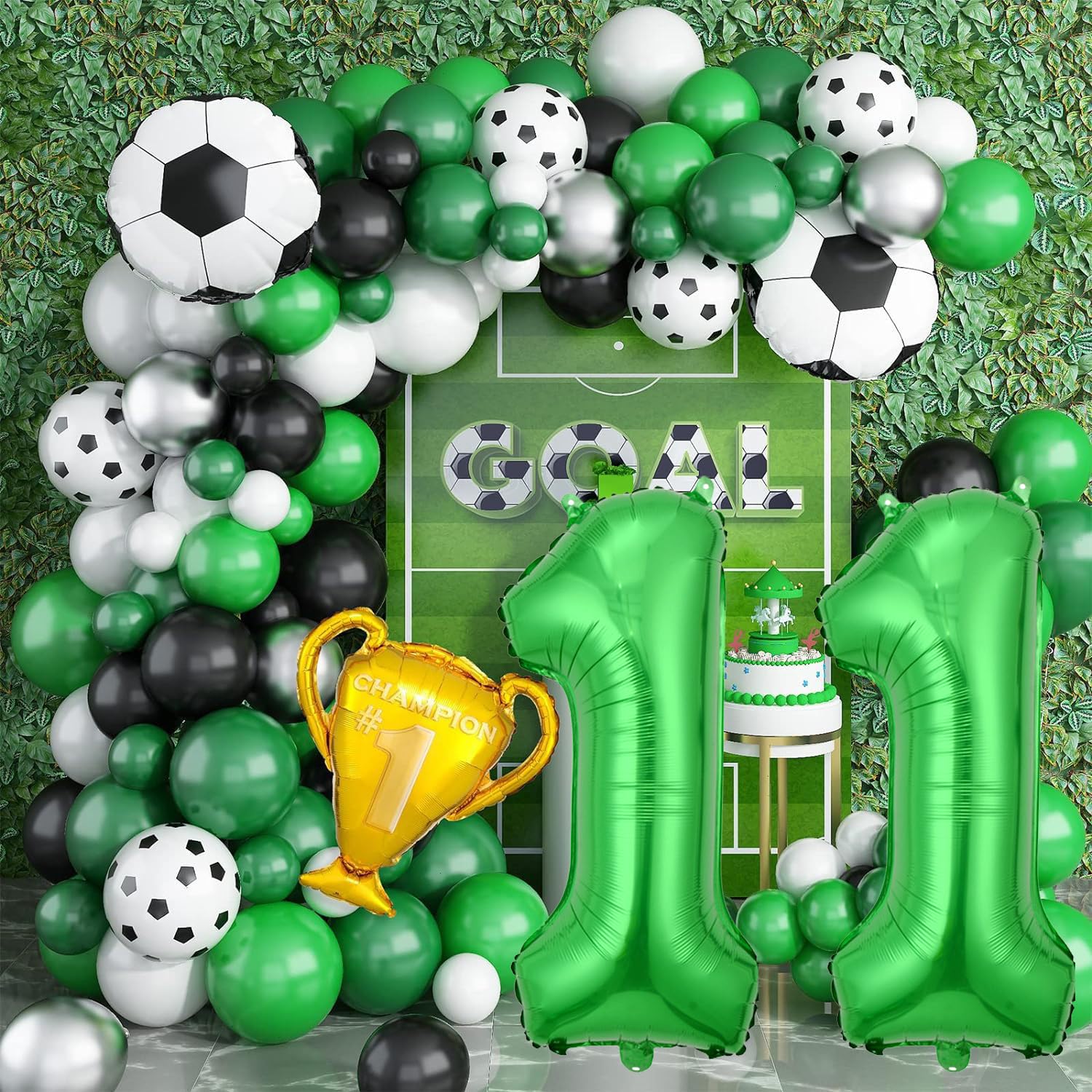 ALL IN ONE DESIGN: Black and White Soccer Balloons with Forest Green 11 Balloon Combination for Great Birthday Decor