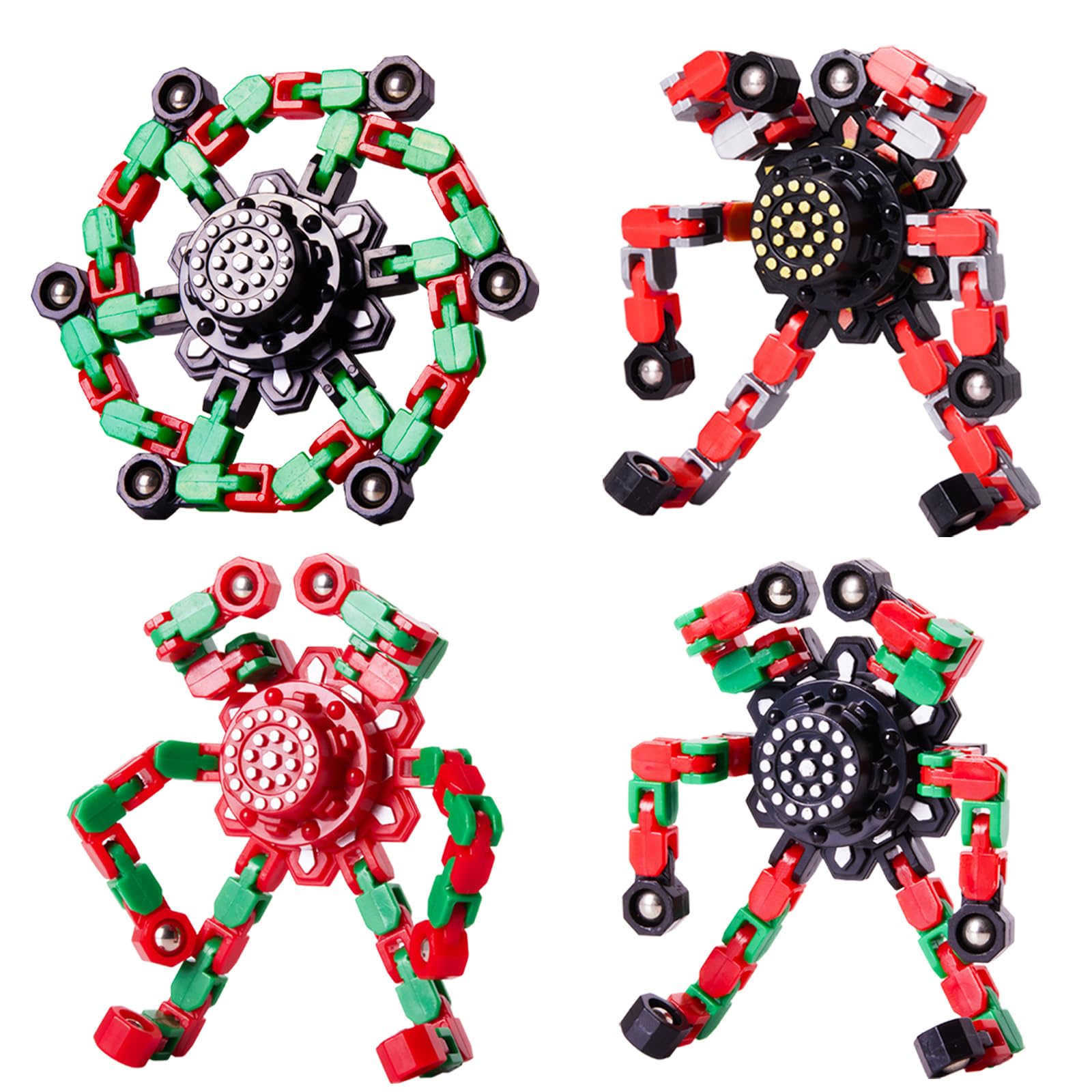 【Transformable Finger Gyros】4 colors (red yellow blue purple) finger spinners included. Each fidget spinner has six deformable chains. Each of the links can pivot and lock into 5 positions, you can create any shapes you want, such as various shapes of spinners, robots and even mobile phone holders. It can also exercise your kid’s hands-on ability, hand-eye coordination and logical thinking ability by changing the shape of the toys 【Cool Fidget Spinners】 Each of fingertip gyro has a a high speed bearing in the center to ensure the smoothest rotation and consistency. 6 deformable chains around the spinner to increase centripetal force and spinning time. So these finger spinners can spin for several minutes 【Stress Relief Toys】It can effectively reduce stress, anxiety and can increase focus and attention by spin the fidget spinners or change the toys’ shape. This is very helpful for children with energetic, obsessive-compulsive disorder, ADHD, autism and adults with high stress and anxiety 【Perfect Gift】Such a creative sensory toy is very suitable as valentines day gifts for kids him, birthday gift, party bag fillers, party supplies, party favor, wonderful incentives classroom prizes ect 【Perfect size】These gadgets are small and can be put in your pocket. Whether you are in the office, school, or on the bus or airplane, you can have fun with these toys anytime, anywhere. The four-pack design also allows you to share your happiness with your family, friends and classmates