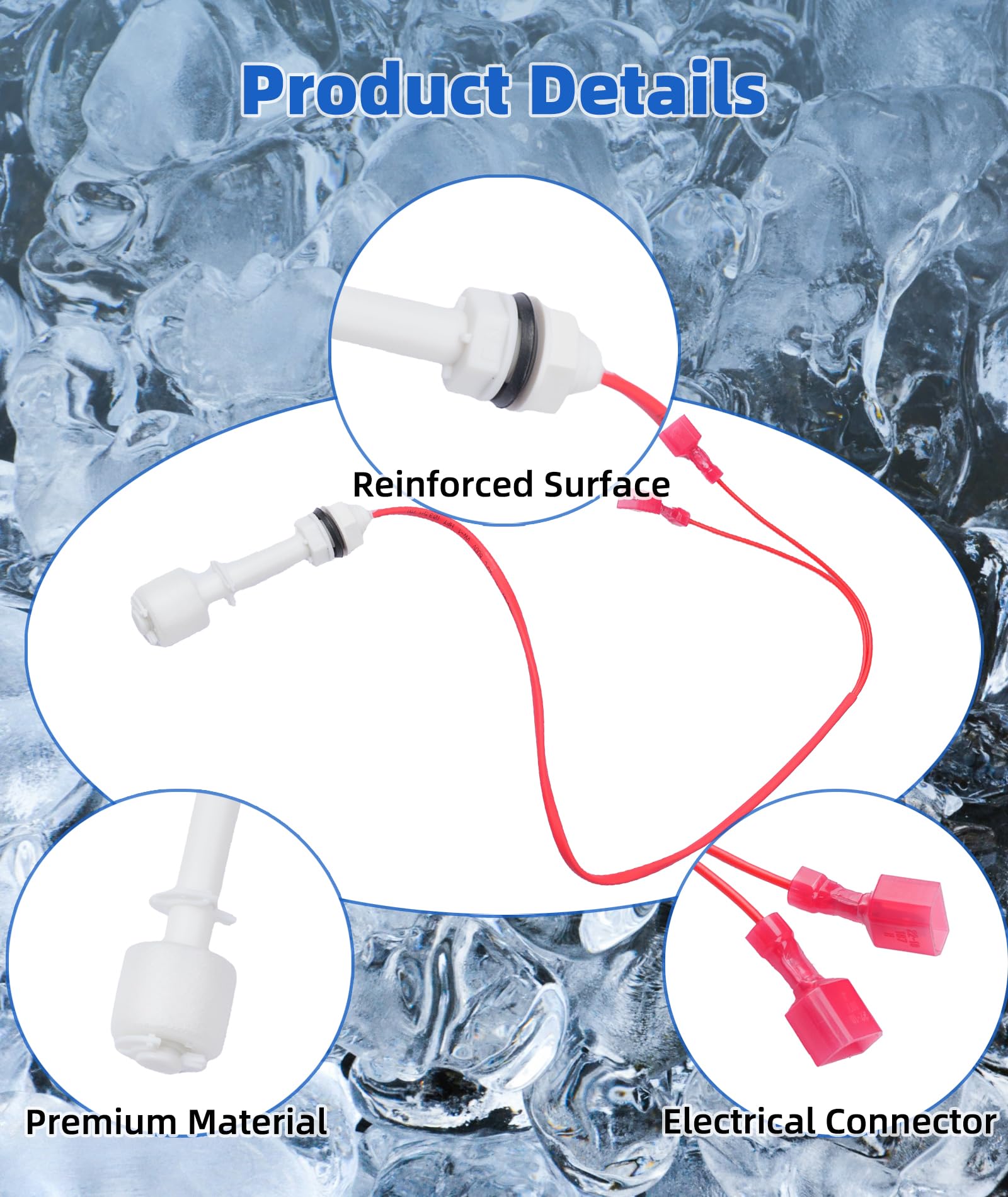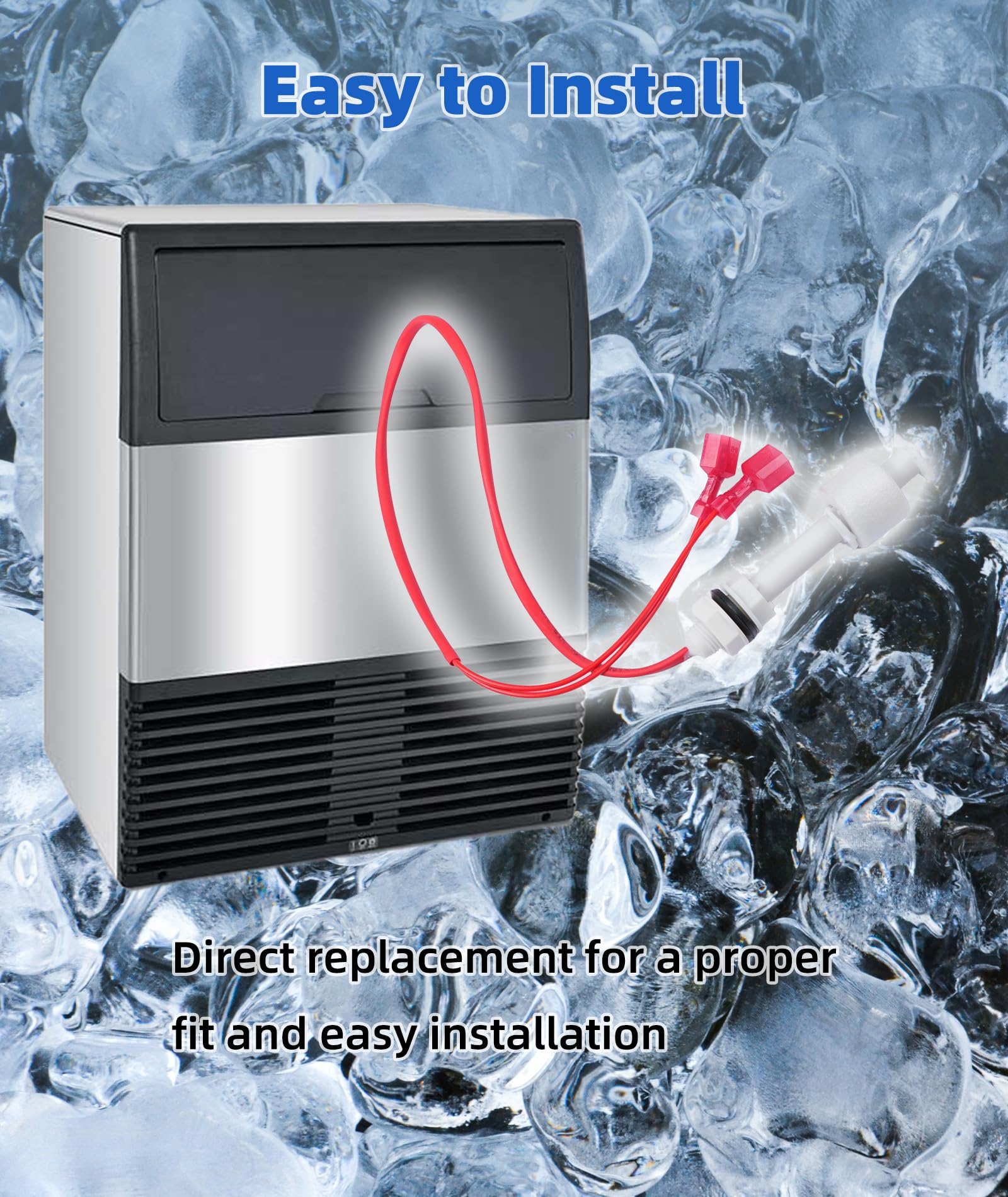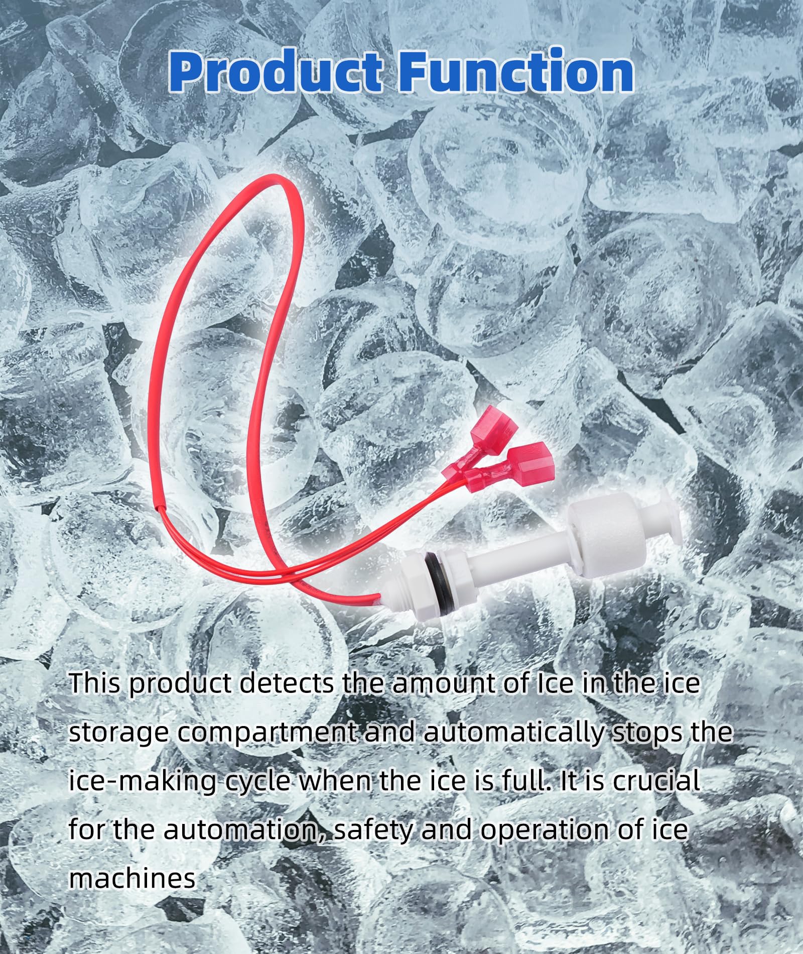 Product Function: This Ice Harvest Float Switch detects the amount of Ice in the ice storage compartment and automatically stops the ice-making cycle when the ice is full. It is crucial for the automation, safety and operation of ice machines