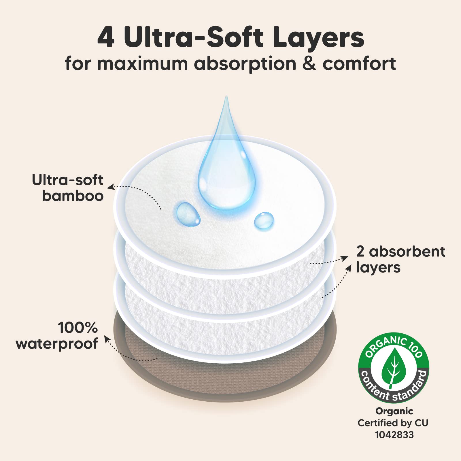Great For Leakages – Leakage is a thing of the past with our 4-layer nursing pads. KeaBabies Nursing Pads feature three layers of ultra-absorbent viscose derived from bamboo, sealed with a protective waterproof outer layer for extra security on the nipple pads. Tip: If you experience a heavy flow, please replace breast pads every 5-6 hours.