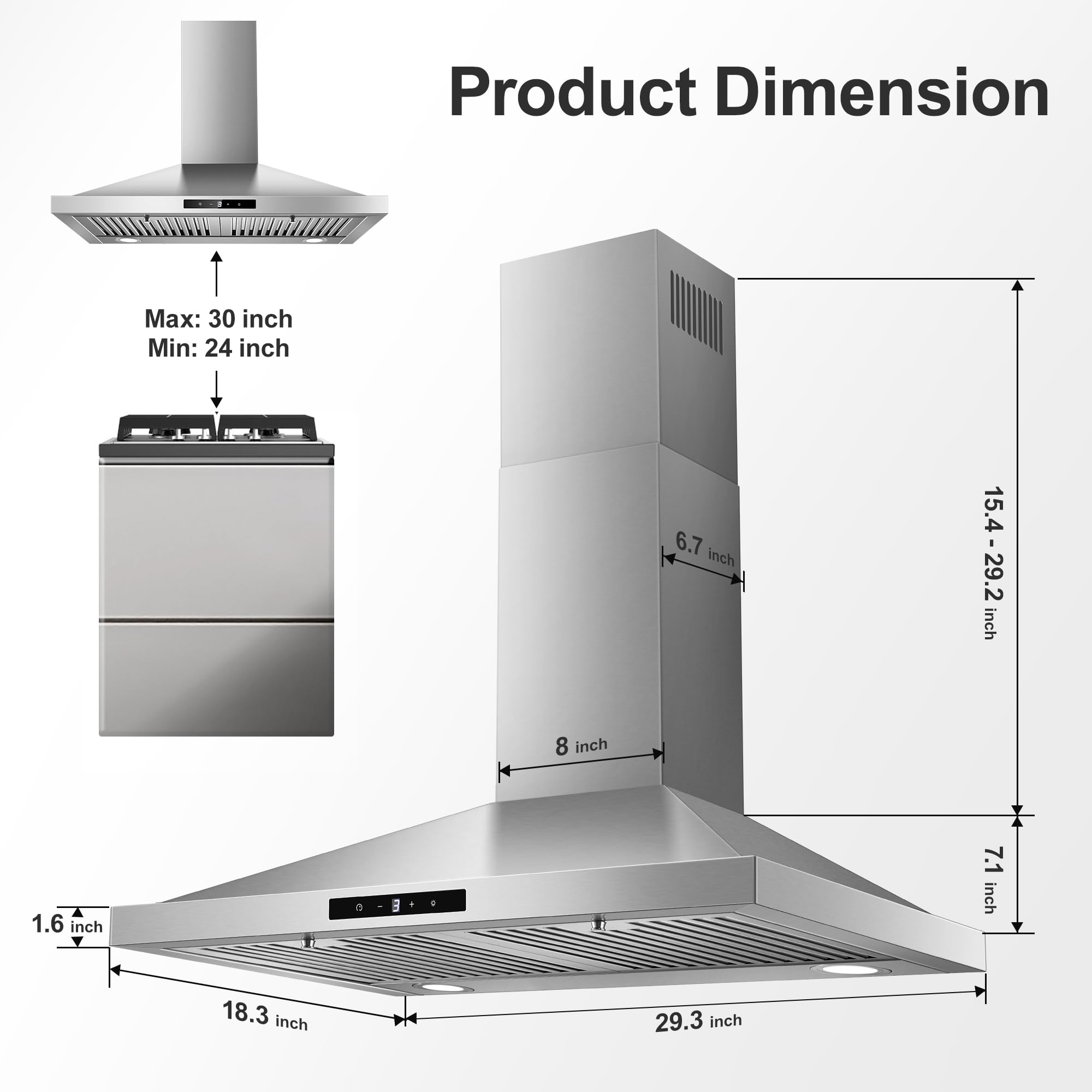 【Adjustable Chimney】: Wall-mounted chimney-style installation perfect for various kitchen decors, adjustable range of chimney: 15-3/4 inch minimum, 29-1/2 inch maximum (40cm-75cm), this ducted kitchen exhaust fan hood fits 7.5- 8.5 ft ceiling. 6 inch round top vent. Extend up to 10ft ceiling with extension, need to sold separately (Part #USGDEX-01)