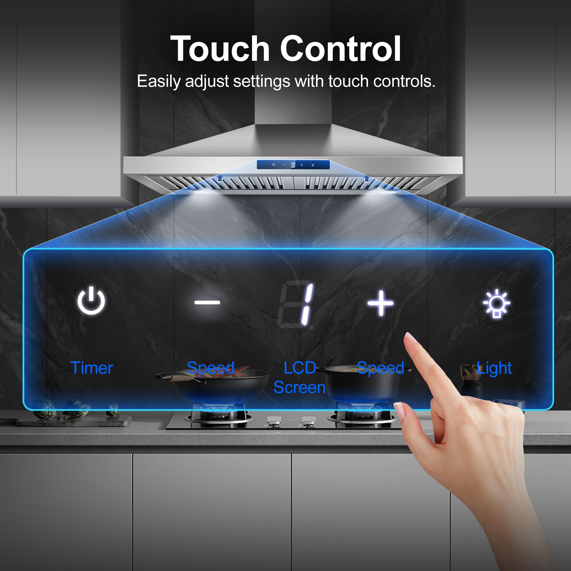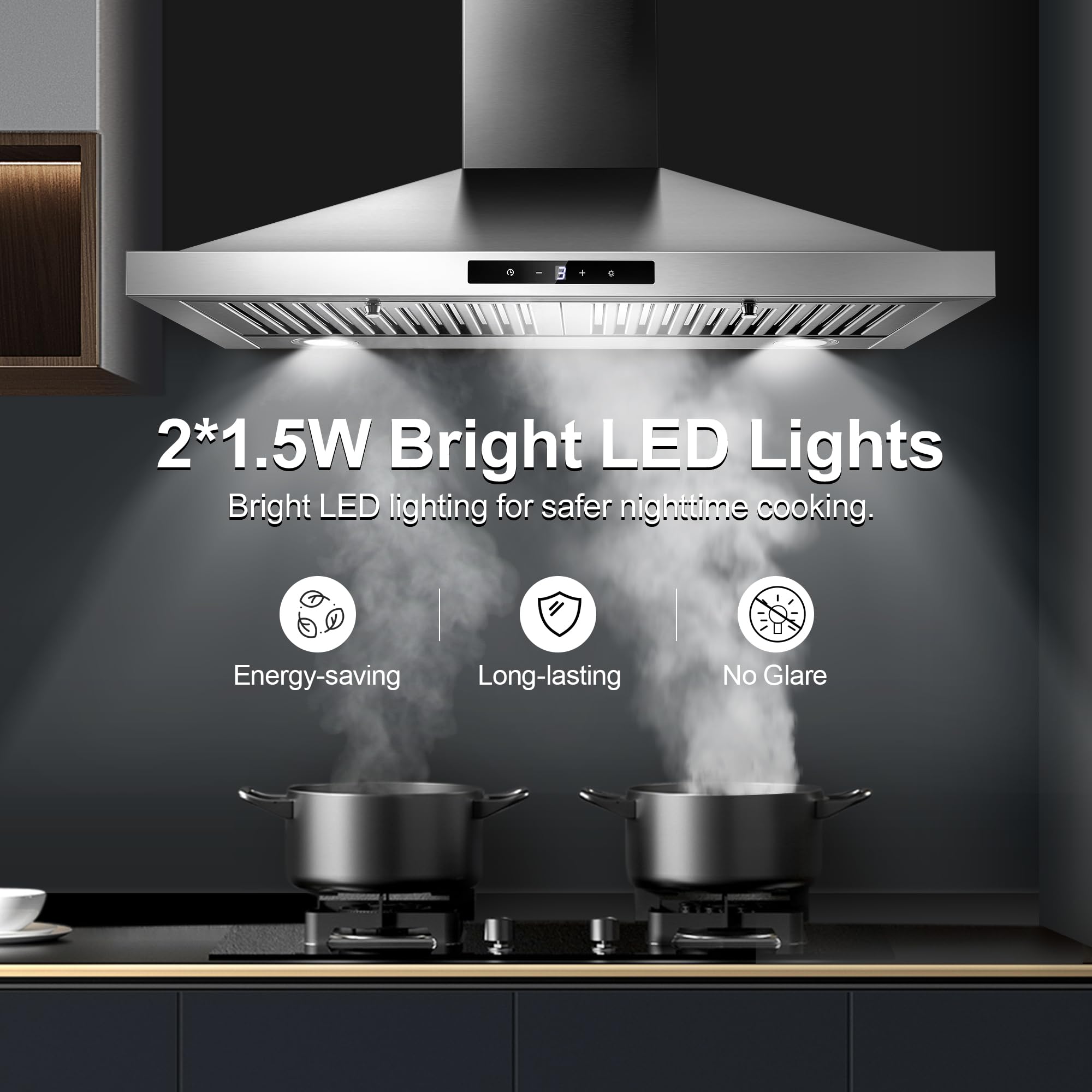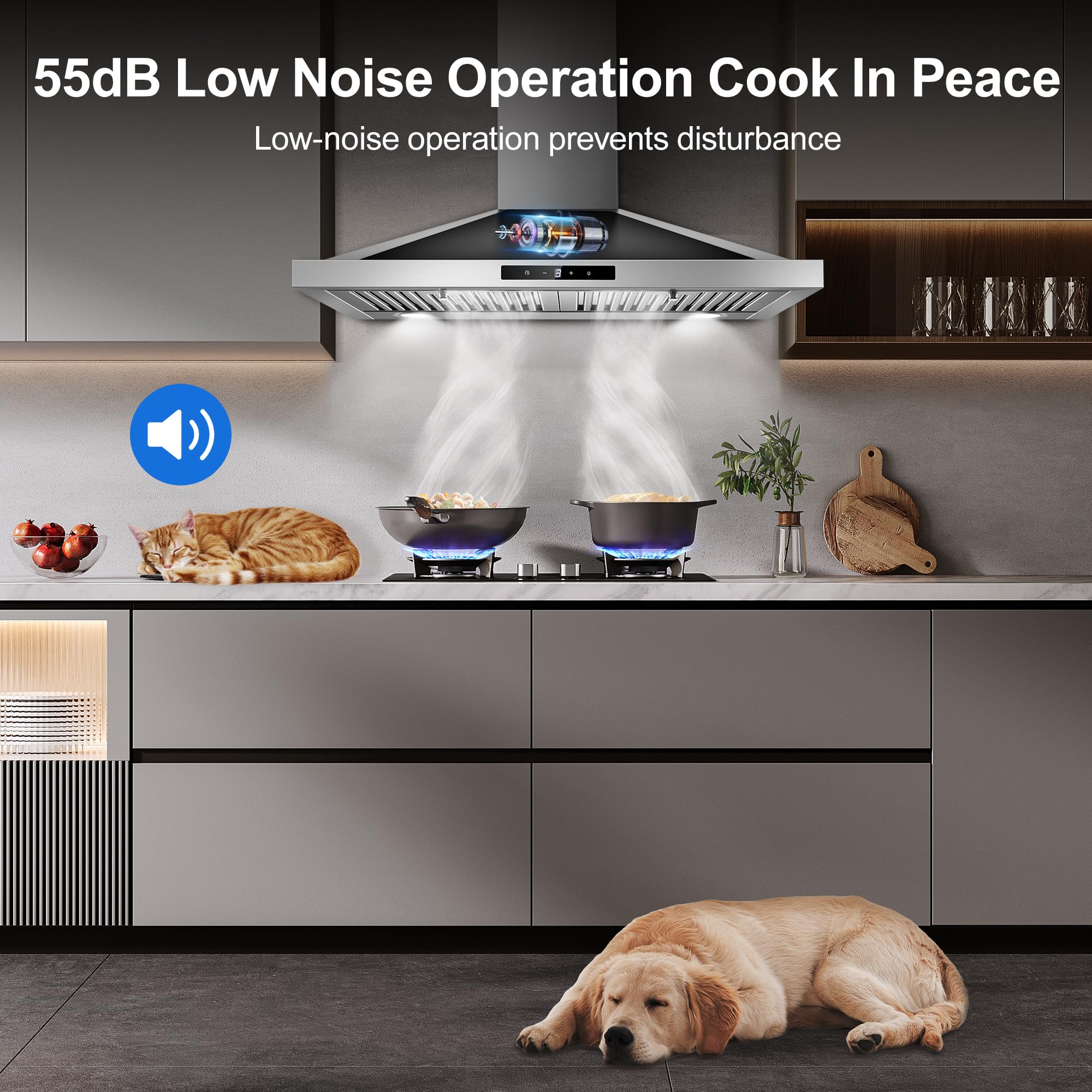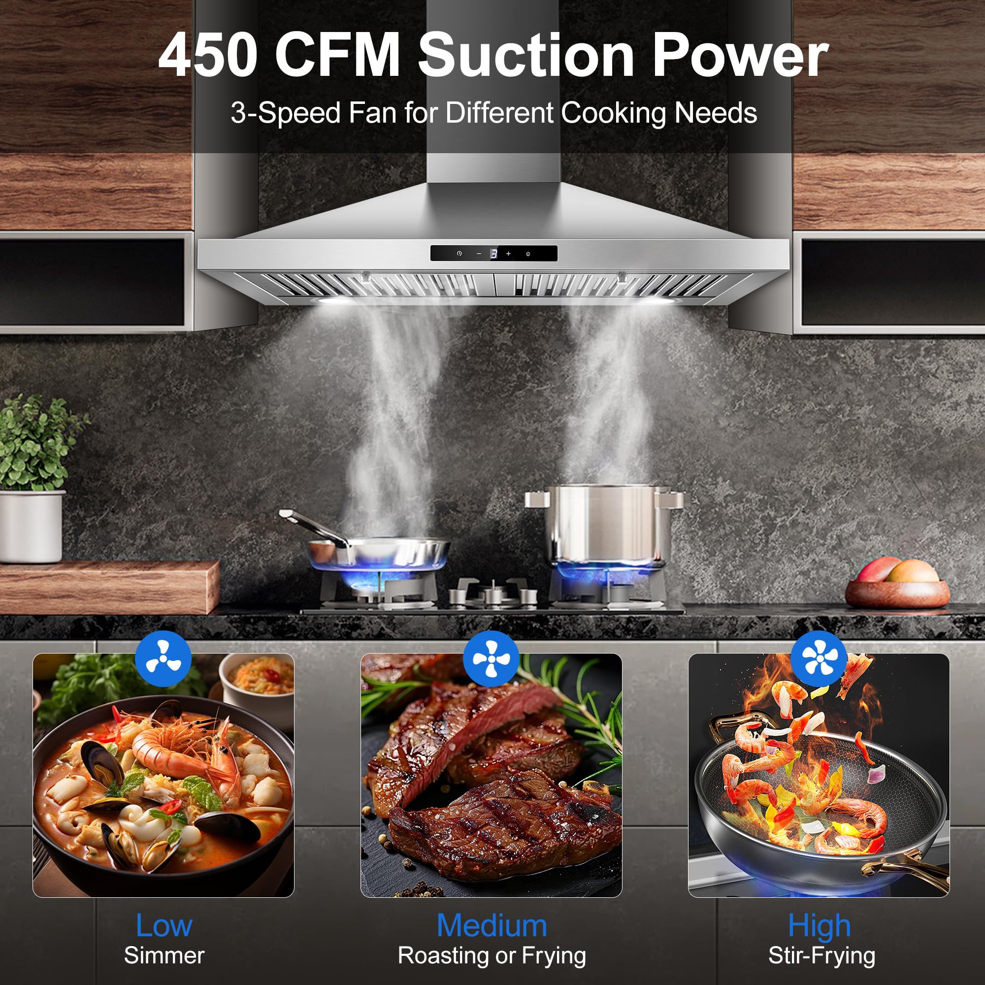 【450CFM Efficient Airflow】30 inch range hood with 450 CFM strong suction power and 3 –speed exhaust fan, effectively removes odors, smoke, and grease. Quiet 55 dB of range hoods provide you with a comfortable cooking environment