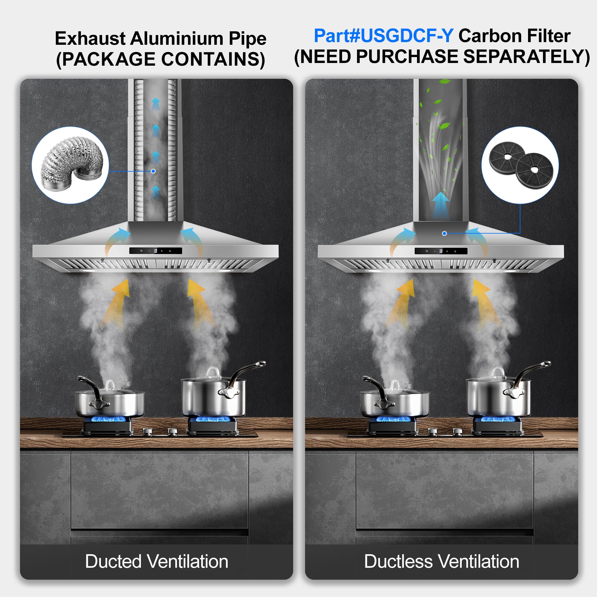 【Dual Installation Mode】Wall mount range hood 30 inch constructed with 430 grade stainless steel. Kitchen hood features a top 6-inch ducted vent that effectively vent filtered odourless air. Convertible to ductless with carbon filter kit(Purchase Part # USGDCF-Y)