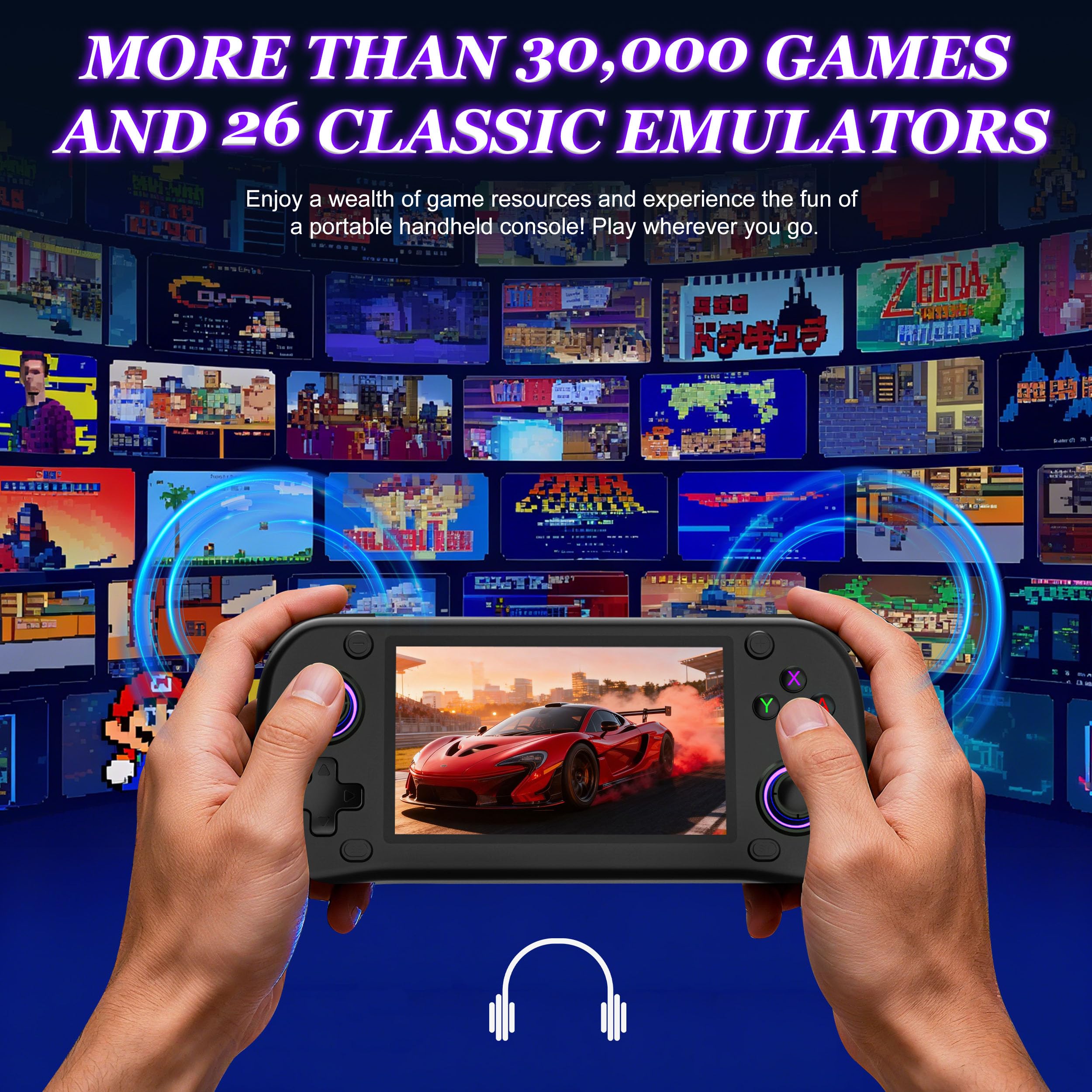 🎮 20,000+ Preloaded Retro Games & 26 Emulators: Dive into classic gaming with over 20,000 built-in games on this handheld game console. Features 26 powerful emulators for authentic arcade, NES, and SEGA experiences—no downloads or Wi-Fi needed. Perfect for travel, gifts, and nostalgic fun.