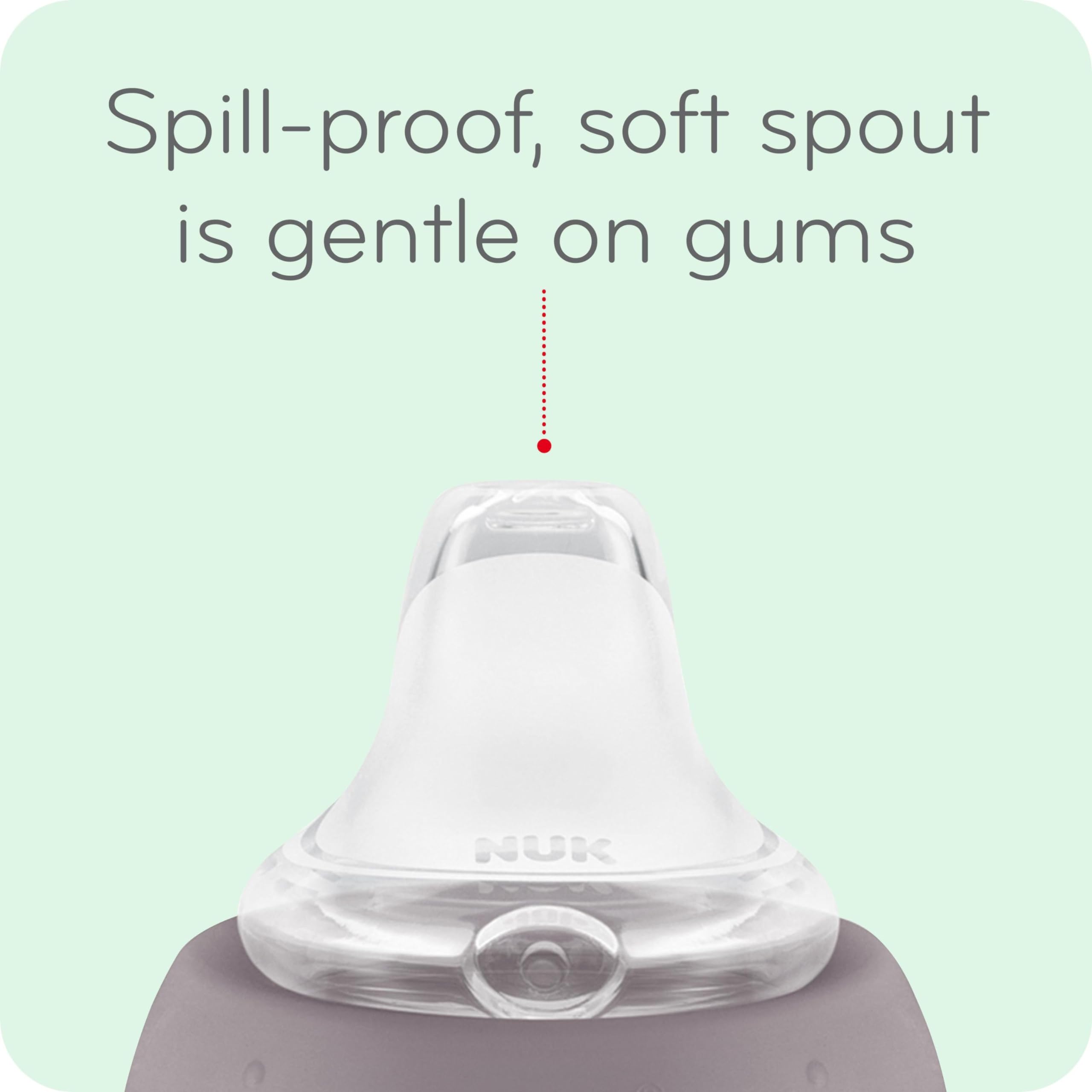 Sippy cup with spill-proof spout designed to be gentle on gums