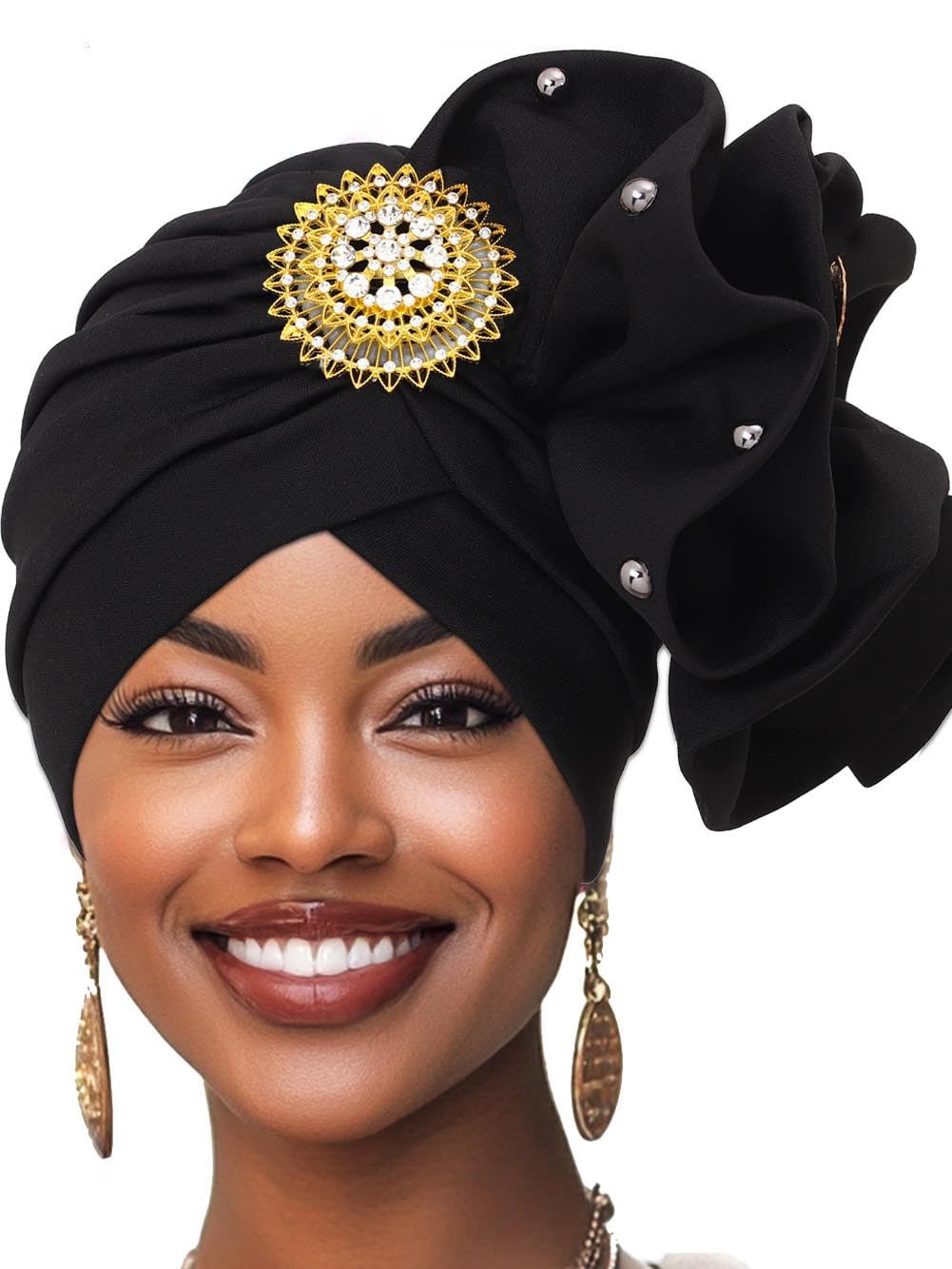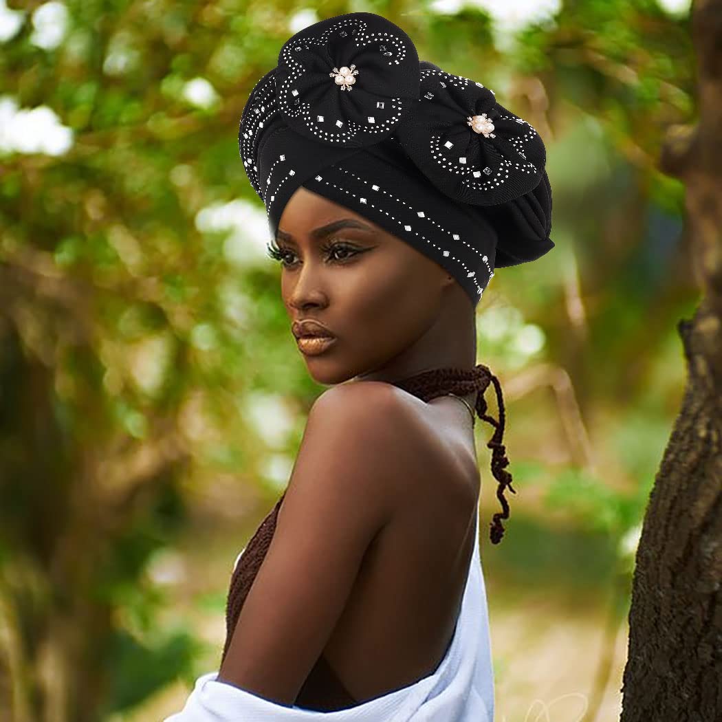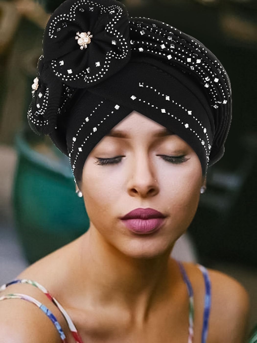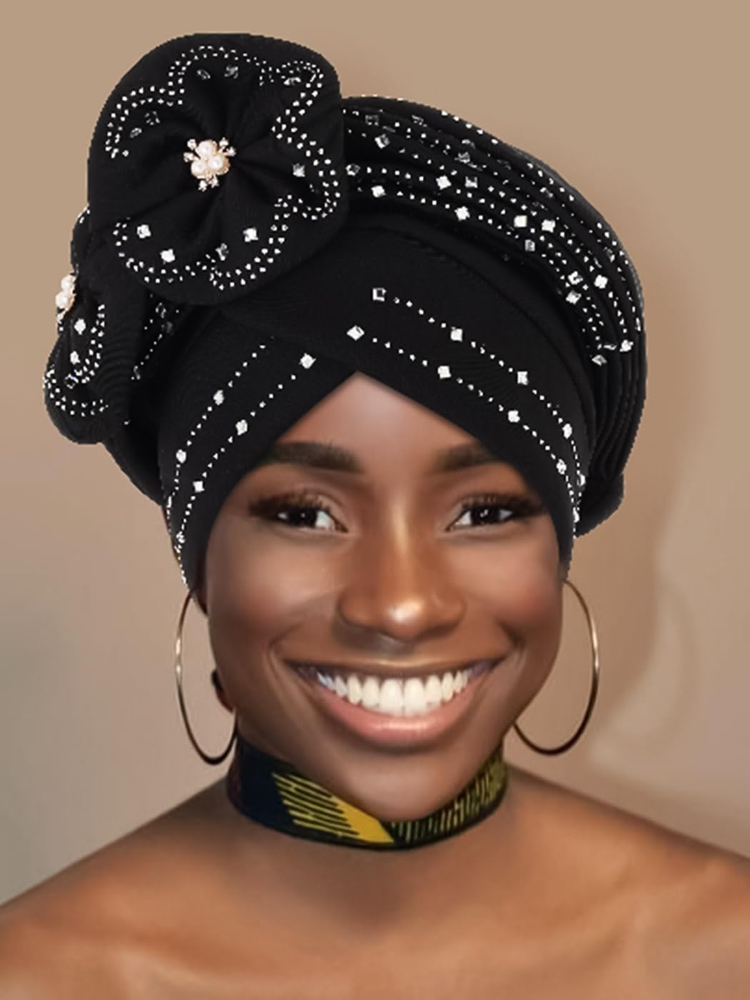 African turban is made of high-quality polyester material with bling rhinestones. The turban consists of two parts. You can tie a knot at the back of the turban to fix the flowers part at the front.