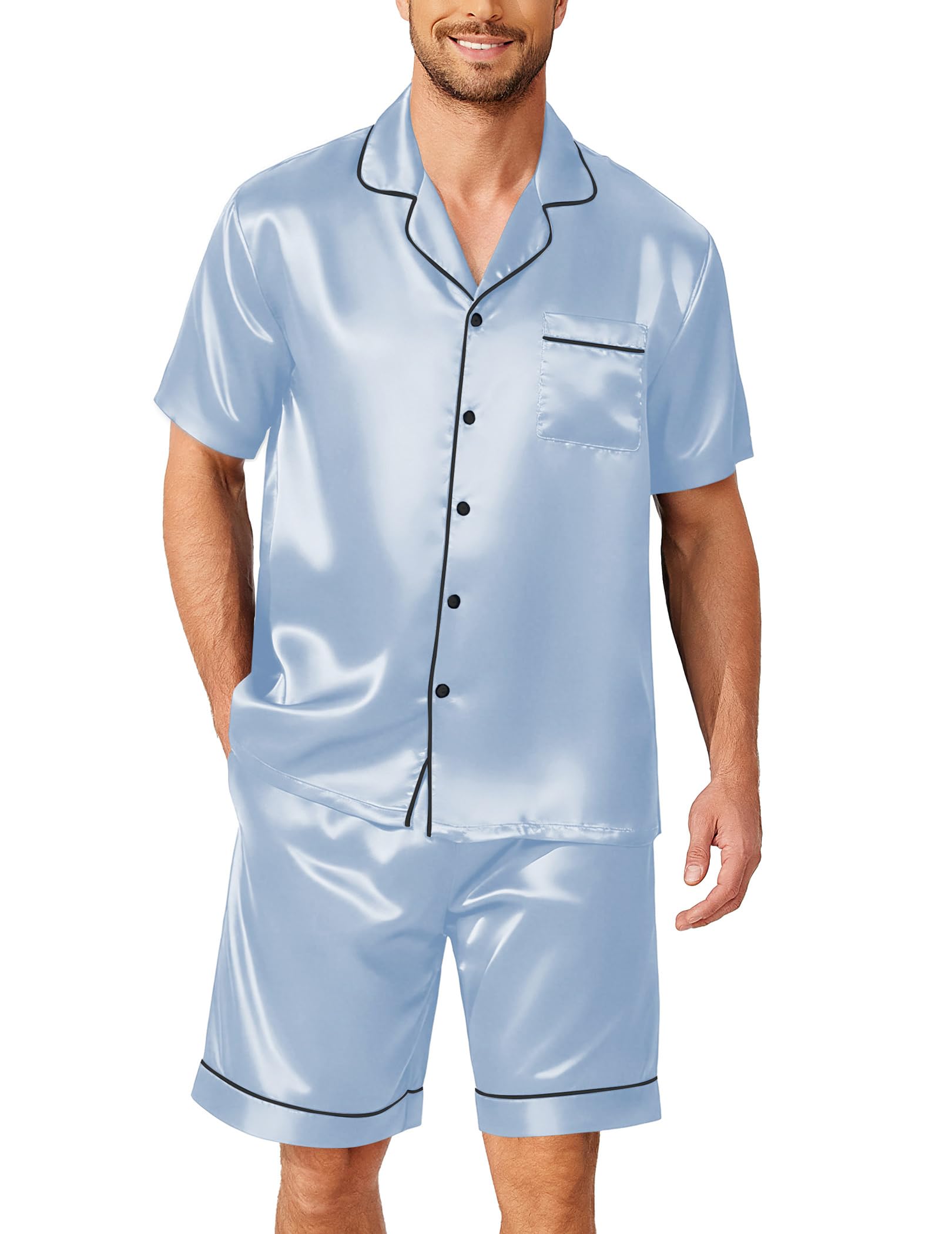 Elegant design:Short sleeve pajama tops, button down front,notch lapel collar and one chest pocket.Matching pajama shorts for women with stretchy elastic waist that fits for any body size.Lightweight and Breathable,perfect for sleeping, lounging, or morning coffee in effortless grace