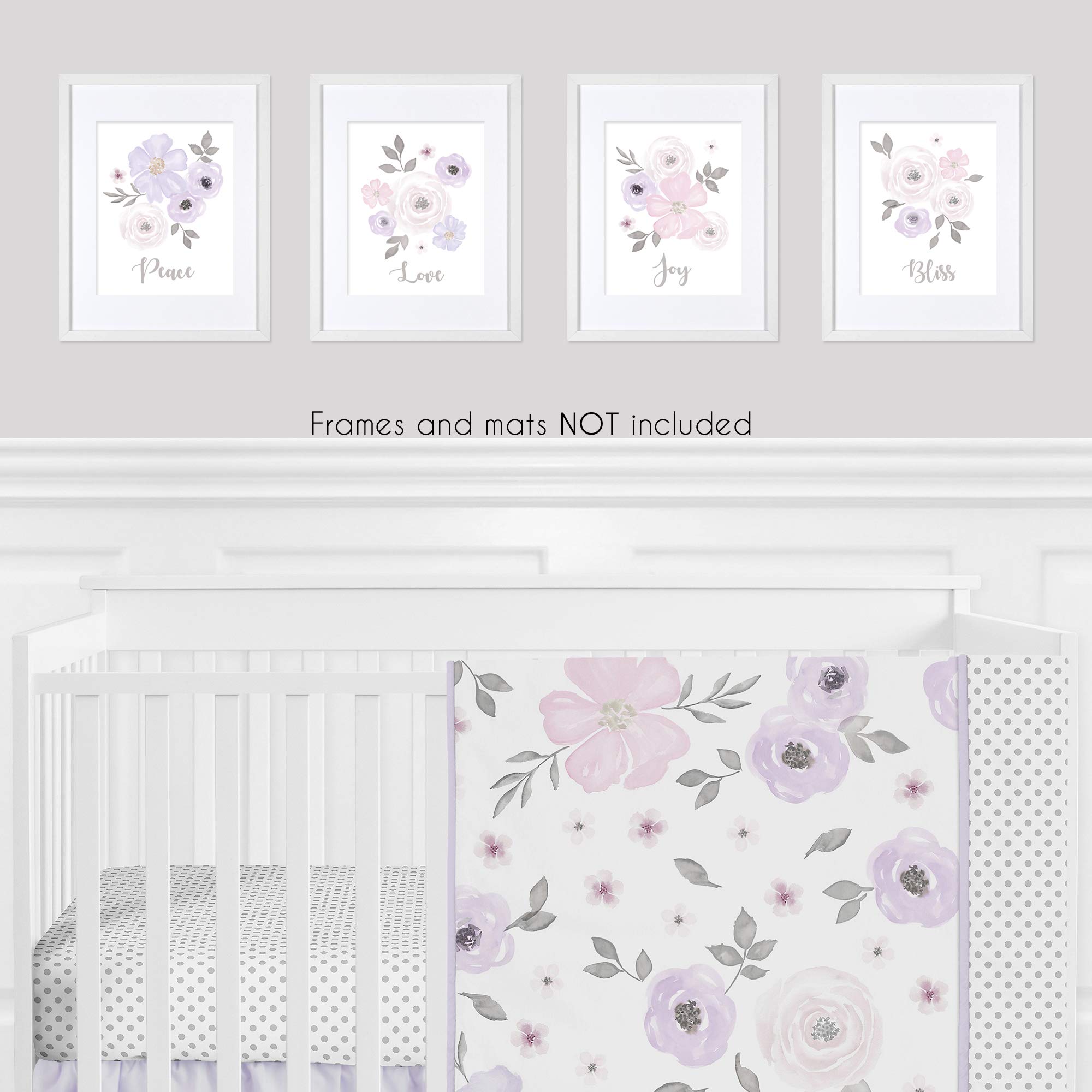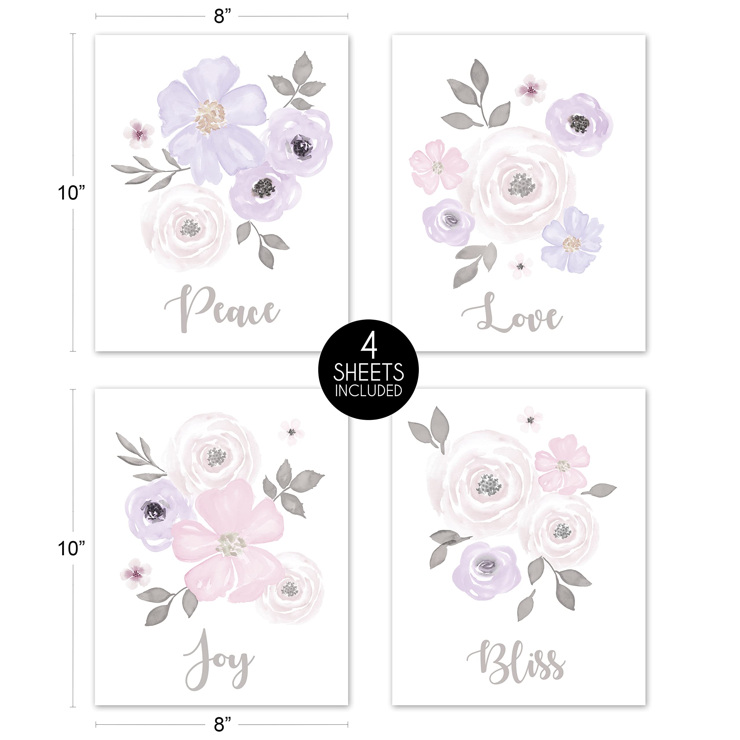 Decorative wall art print set features watercolor flowers with inspirational "Peace", "Love", "Joy" and "Bliss" quotes.