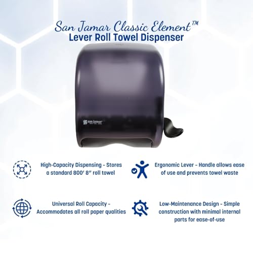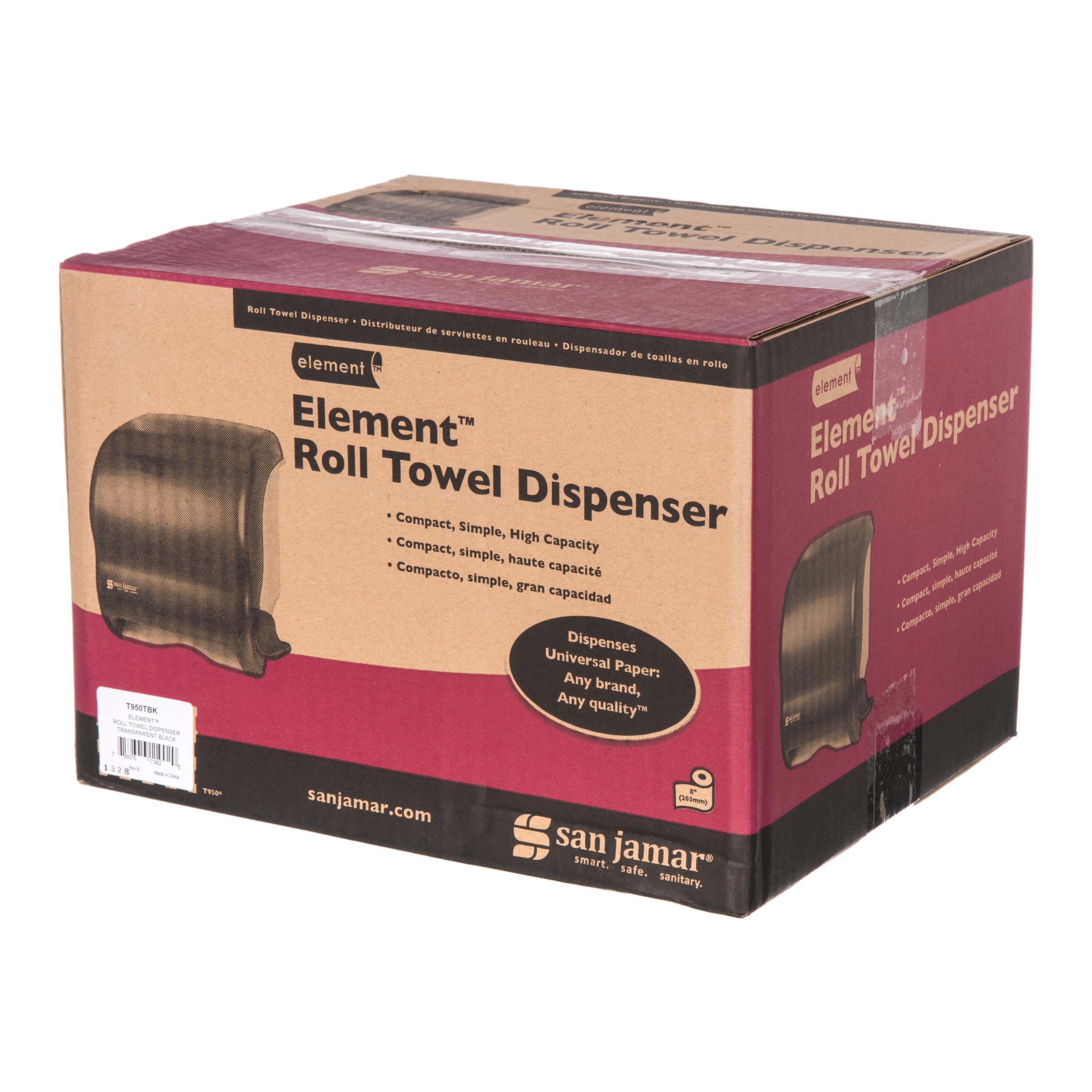The San Jamar Classic Element Paper Towel Dispenser is the ultimate solution for your high-capacity paper towel needs in bathrooms, kitchens, and restaurants. This wall-mounted roll dispenser is designed to fit all core sizes, including coreless, solid, and centerpull rolls, making it a versatile choice for various paper qualities. Equipped with an ergonomic lever, this dispenser promotes easy and efficient towel dispensing while preventing wastage, ensuring cost-effectiveness and convenience. Its push dispenser mechanism ensures quick access to towels, ideal for high-traffic areas where efficiency is paramount. Crafted from durable plastic in a sleek black pearl finish, this dispenser combines functionality with a modern aesthetic, perfect for enhancing any restroom or kitchen space. Its universal design accommodates all types of paper towels, making it a practical choice for commercial settings like restaurants. (Model Number - T950TBK).