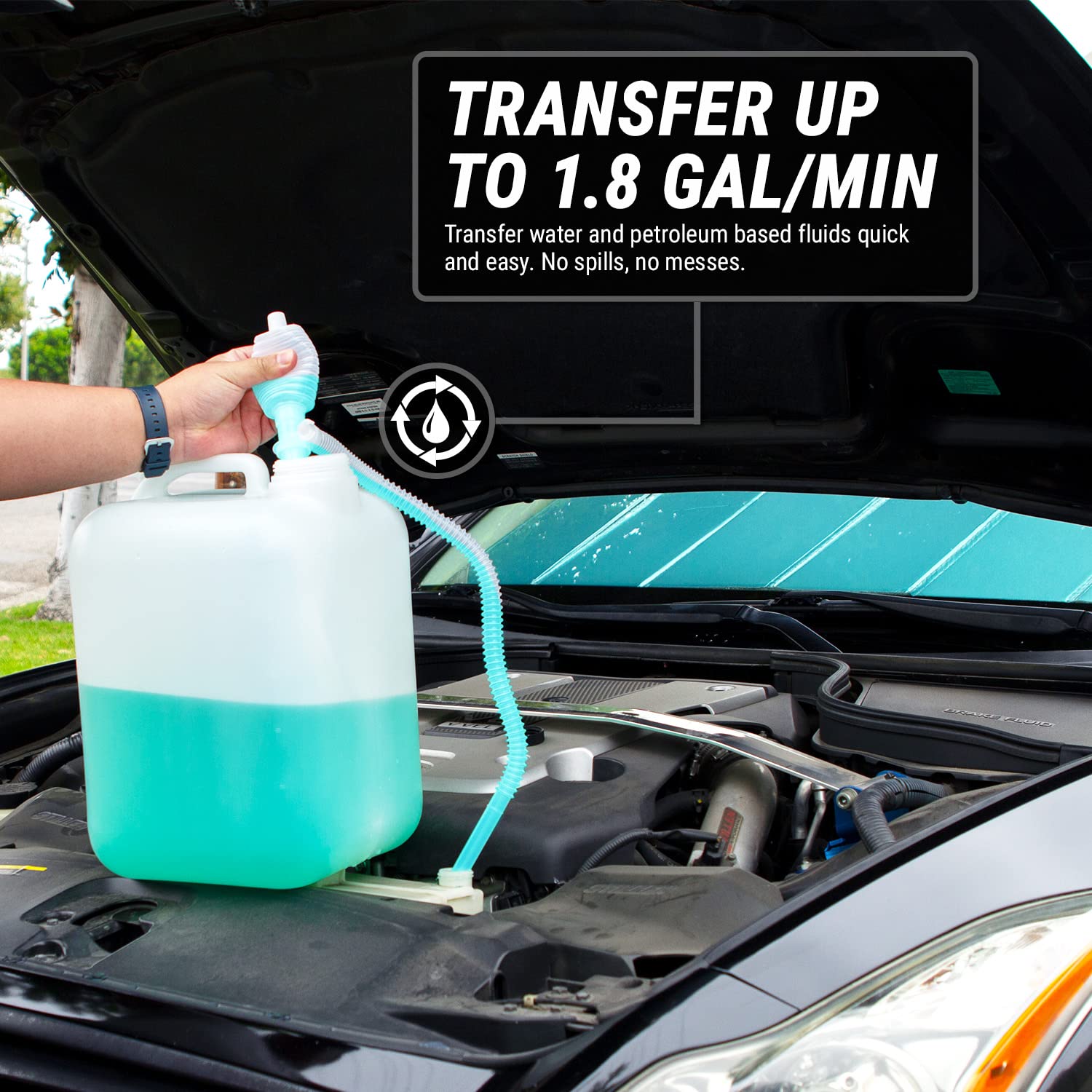 FLOW RATE - Transfer Liquid Efficiently, Safely, and Hassle-free. Drain 3-Gallon or 5-Gallon Gas Cans, Jerry Cans, Racing Cans at a Flow Rate of 7 Liters per Minute or 1.8 Gallons per Minute. BPA-Free, Safe for Drinking Water - Unique, Pate tended Suction Tube ( 18.25-inch ) for Flexible for irregular containers and rigid for taller cans