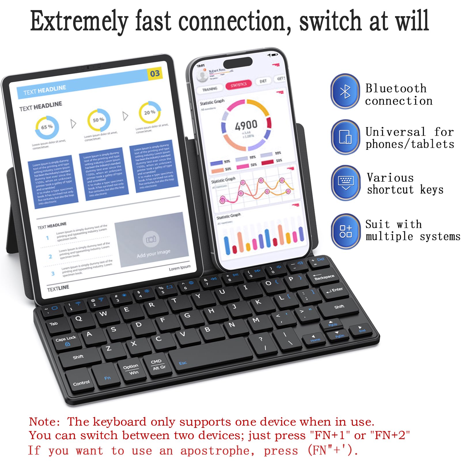 ♙【Connect Two Devices】- The mac keyboard only supports one device when in use but after the two devices are successfully connected, you can switch between them,just press "FN+1" or "FN+2", and the corresponding indicator light will light up.only connect the iphone keyboard to your deivices,the shortcuts work with different OS seamlessly.Note-Esc function: Press "Fn" + space bar, Lock/Unlock the keyboard: Press "Fn" + Caps Lock, Shortcut Keys: Press "Fn" + shortcut keys,Apostrophe:FN" + '