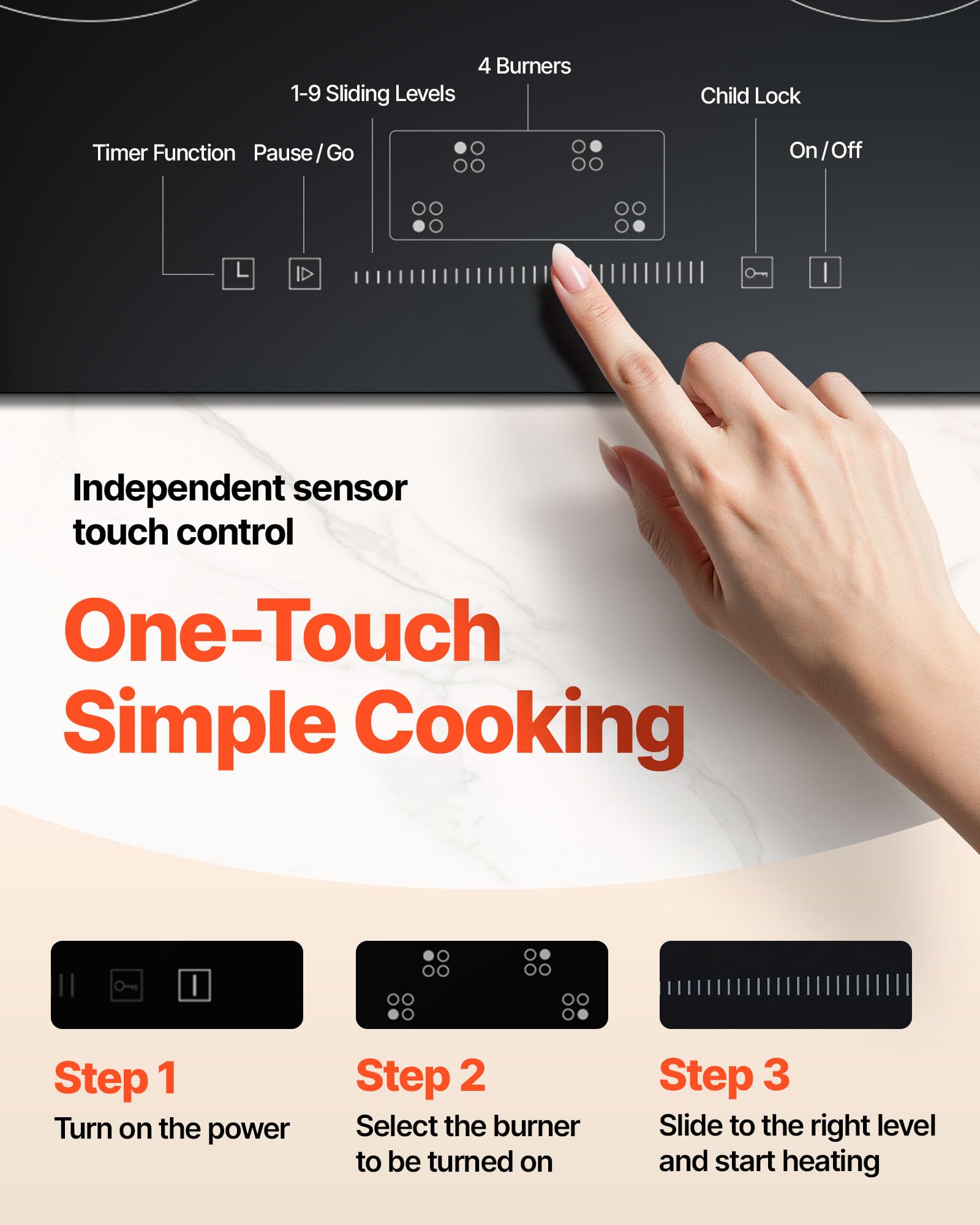Sensitive Touch Control: The sliding touch panel allows precise heat adjustment with a simple swipe or tap. With 4 independent burners and a 1-99 minute timer, plus a pause button, it provides flexible and easy control.