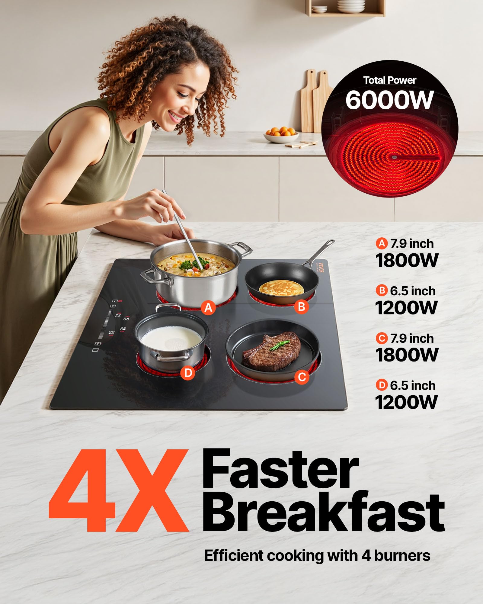 Powerful Performance: This built-in ceramic cooktop delivers up to 6000W of power with 9 heat levels, ideal for stewing, frying, steaming, boiling, and grilling. Featuring 1200W + 1800W + 1200W + 1800W high-power, evenly distributed heat technology, it quickly warms ingredients, significantly reducing cooking time for faster, delicious meals.