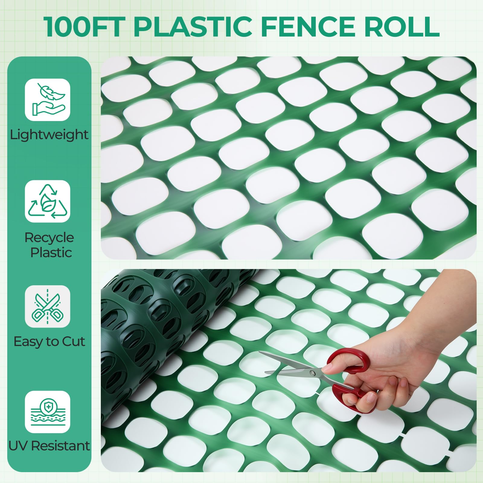 Enliven Your Garden: Ohuhu 4×100ft/10.7LB plastic garden fence acts as an effective garden fence animal barrier that defends your carefully tended landscape. The 1.7×1.7in mesh allows ample airflow and sunlight for healthy plant growth, while keeping out unwanted animals and passersby to safeguard your flowers, vegetables and outdoor space