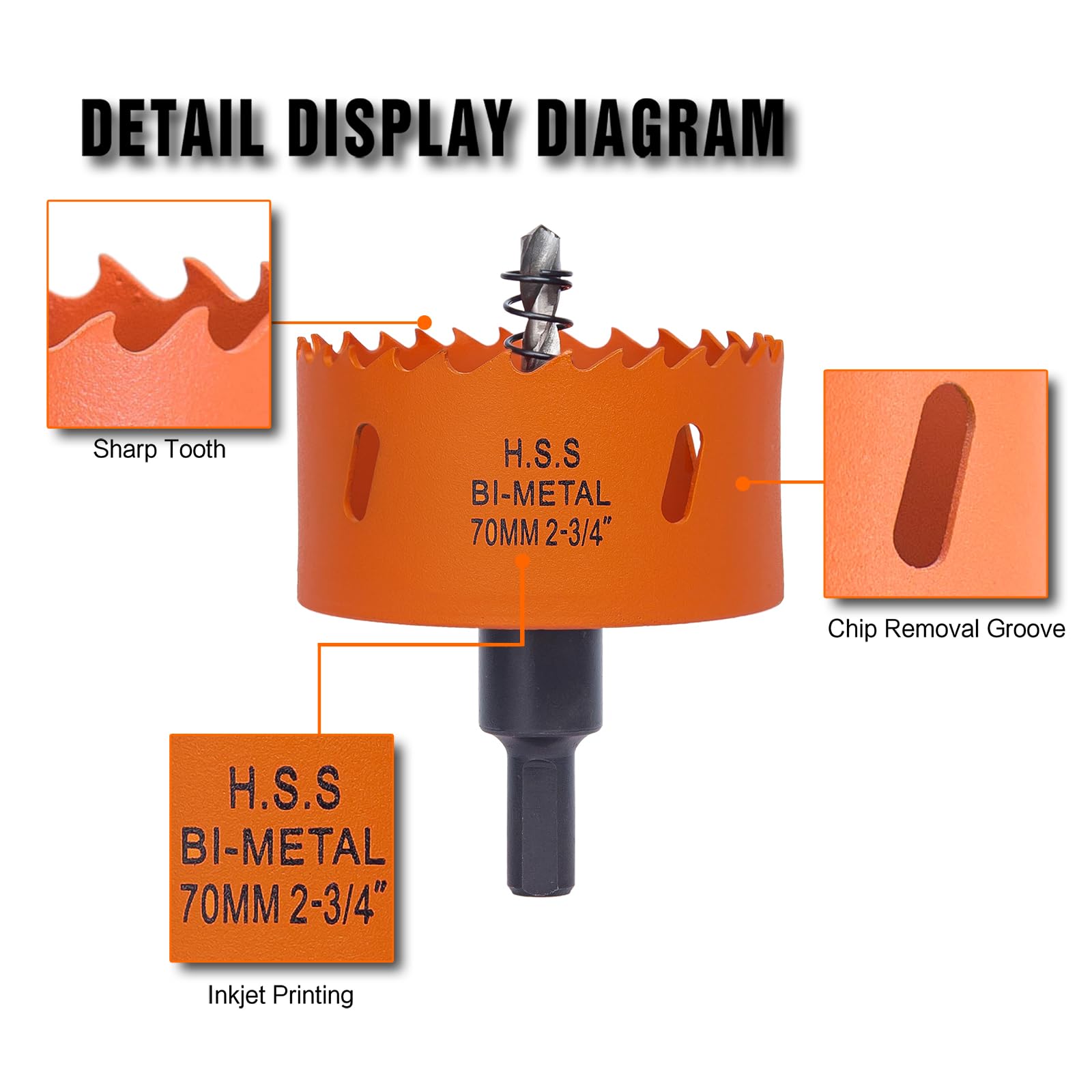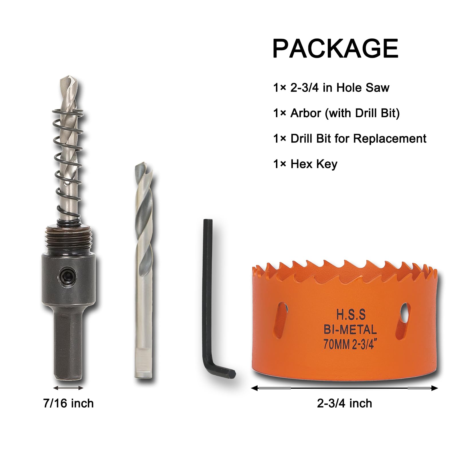 Package Included: 1 pc 2-3/4 inch hole saw, 1 pc arbor(with 1 drill bit), 1 pc replacement drill bit, 1 pc hex key