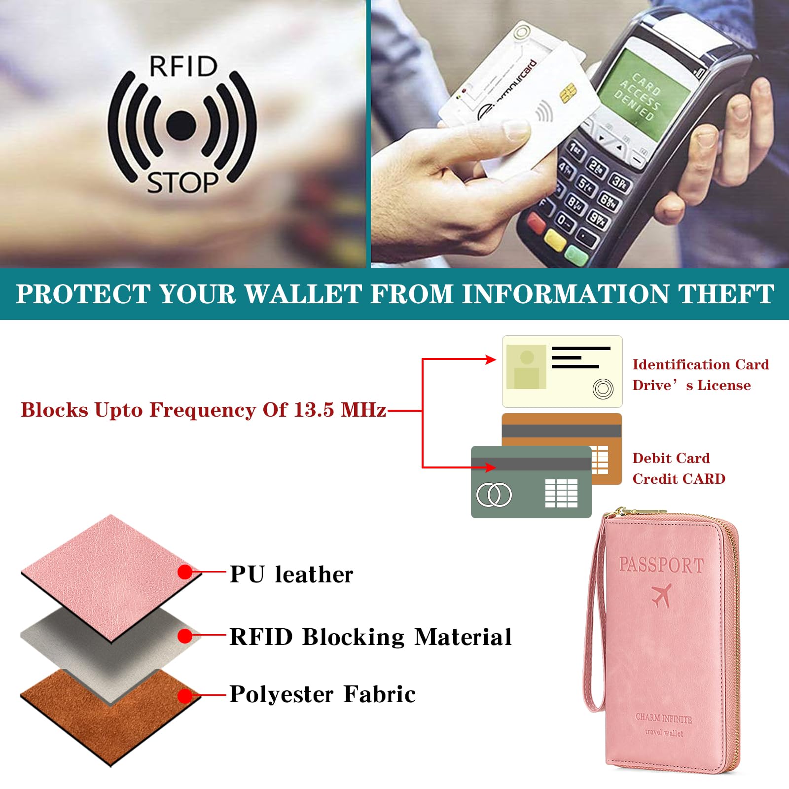 RFID Security: The passport holder rfid blocking has a special material to block RFID signals so that the passport organizer can protect your personal information in your passport and credit cards from unauthorized scans. RFID blocking shielding material of the passport holder men women is used to prevent thieves from swiping your credit card to steal your personal information in airports or crowded places