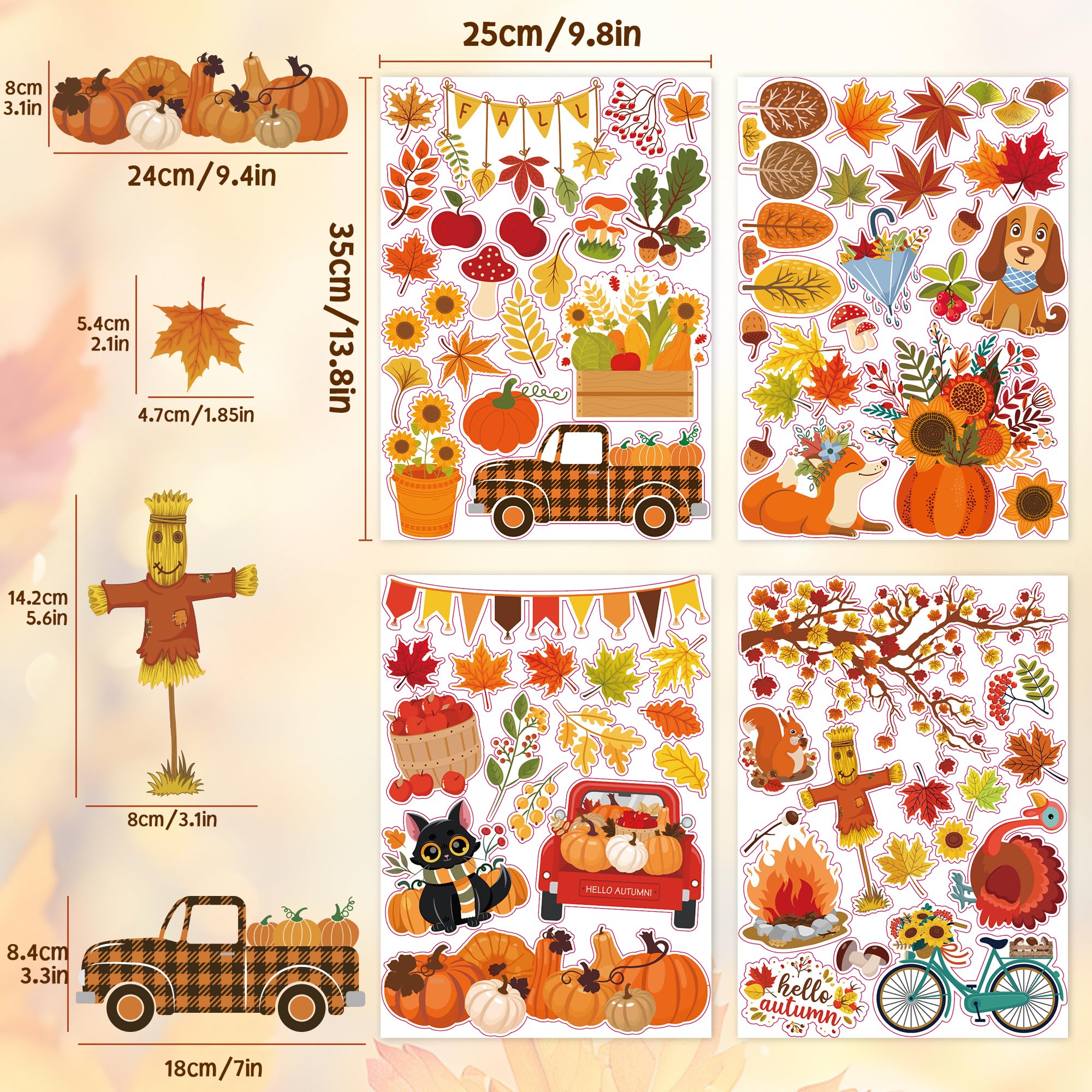 Package Includes - You will receive 4 large sheets, totaling 71 small pieces of fall window clings. Sizes vary, with the largest sheet measuring 35cm/13.8in in height and 25cm/9.8in in width, and the smallest element sized at 4.7cm/1.85in. These abundant pieces meet all your needs for fall decorations, perfect for various fall decor projects.