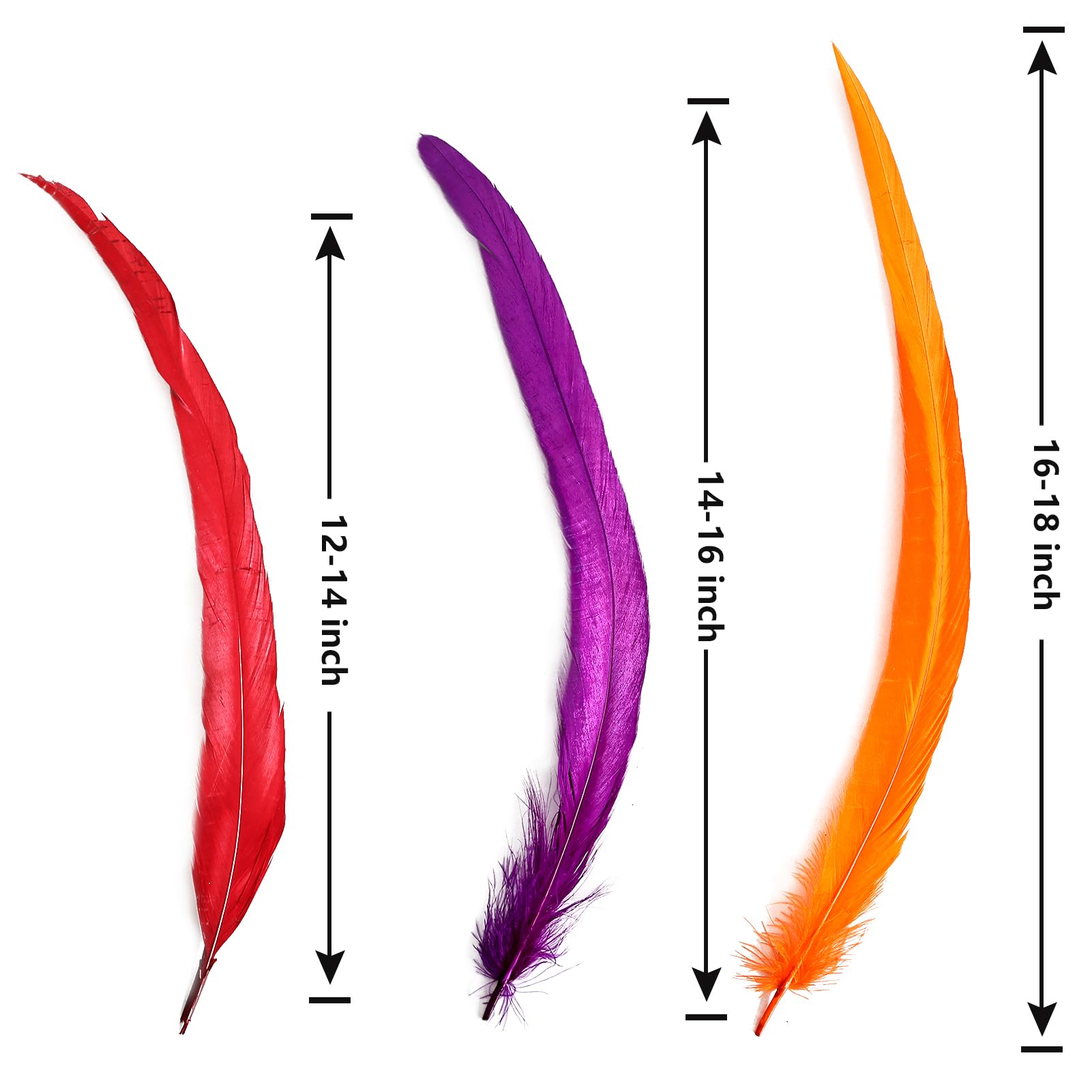 ❤️Feather size: There are four sizes for you to choose,size is divided into 12-14inch (30-35cm),12-14inch(35-40cm),16-18inch(40-45cm).These are real rooster tail feathers, each one is unique and the shape may vary.