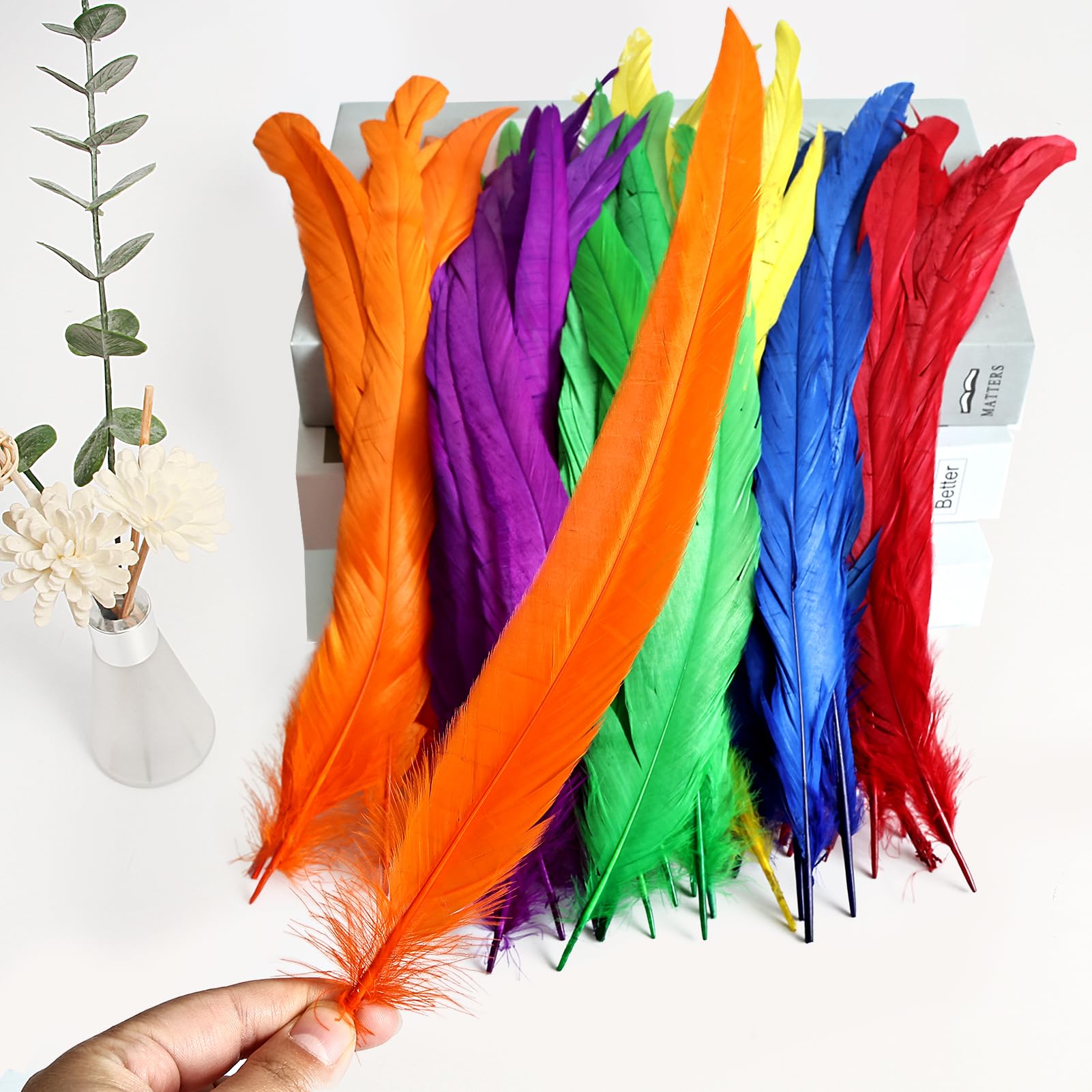 ❤️Daily care: If there is dust on the feathers, simply move the feathers to remove the dust. It mustn't be washed with water. You can store the feathers in a cardboard box or a paper tube to ensure the feather's ductility. Mix Colour rooster tail feather sometimes have static electricity,or if the feathers are deformed during storage, you can soften the feathers by placing them on top of water vapor to automatically restore their suppleness.