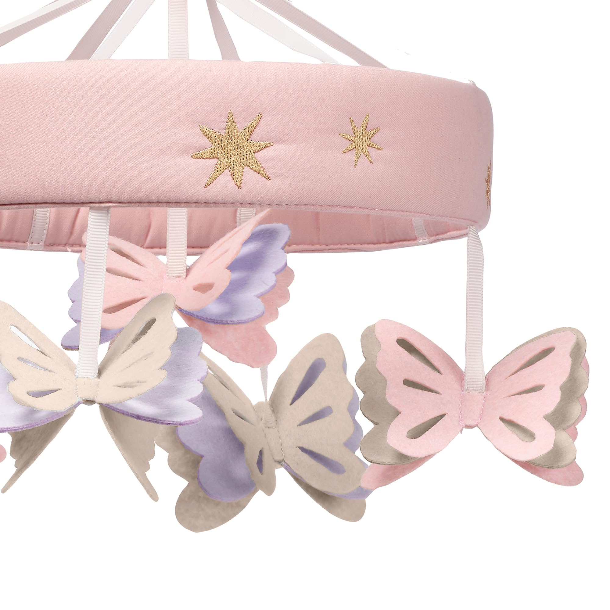 Five colorful butterflies flutter around a soft pink ring adorned with 11 gold embroidered stars