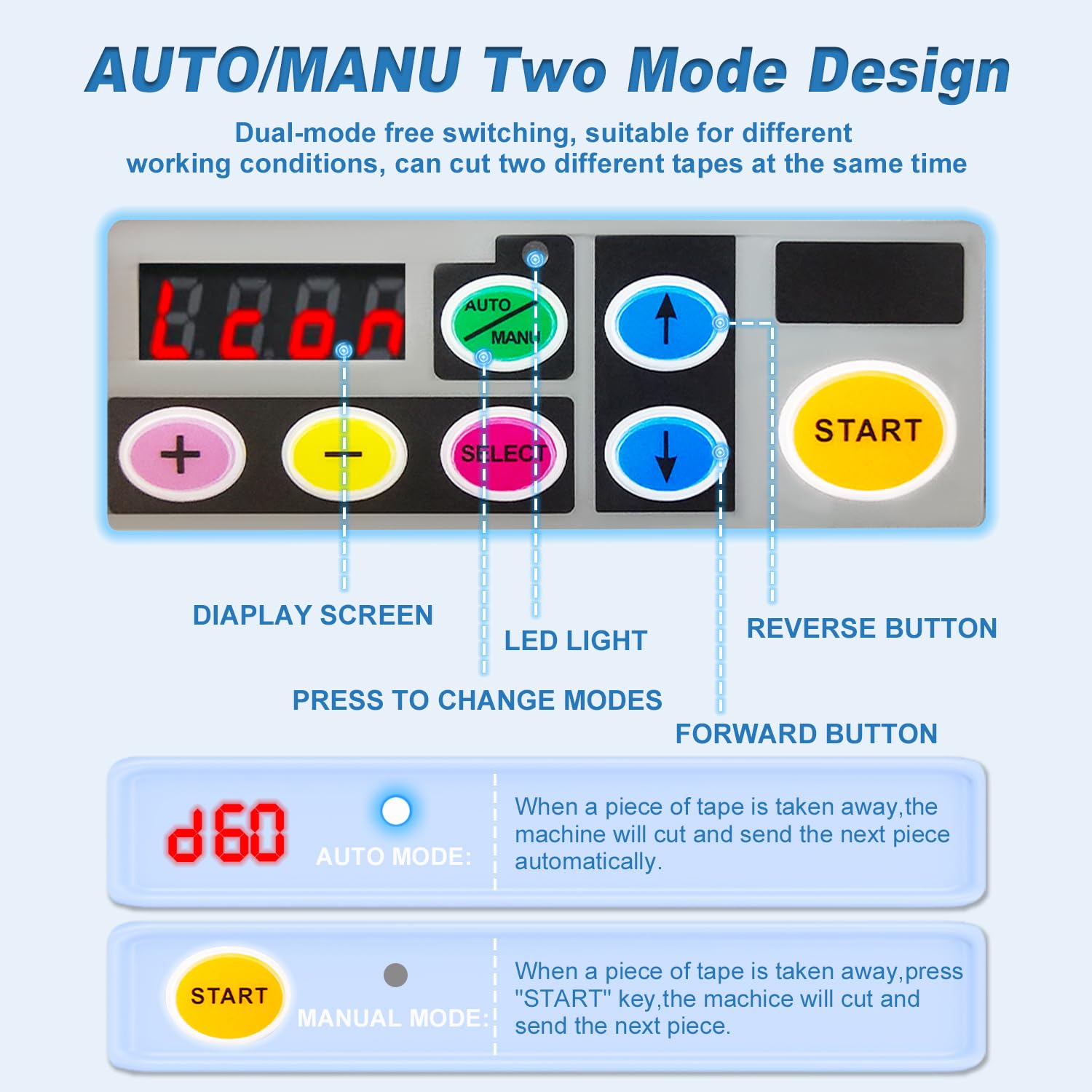 [Convenient Automatic/Manual Mode] The automatic tapedispenser cutting machine can switch automatic and manualmodes to meet different needs.in automatic mode,make sure thatthe led lamp is flashing,Press the start button once, ribbon cuttingmachine will feed in a piece of tape then cut it out based on yourset length;in manual mode,make sure that blue led lamp is offTocut another piece, press start button again.lf you need to cutribbons, please use the "Lcon" mode,you can check the manualpage 10 for details.