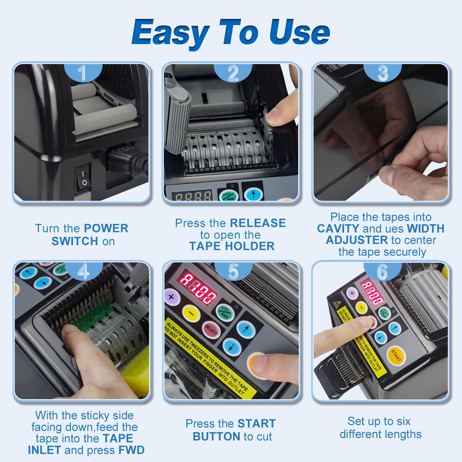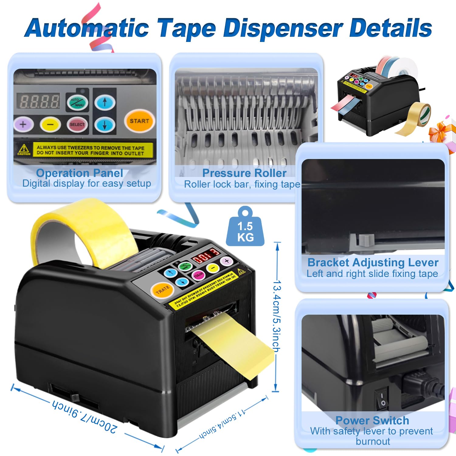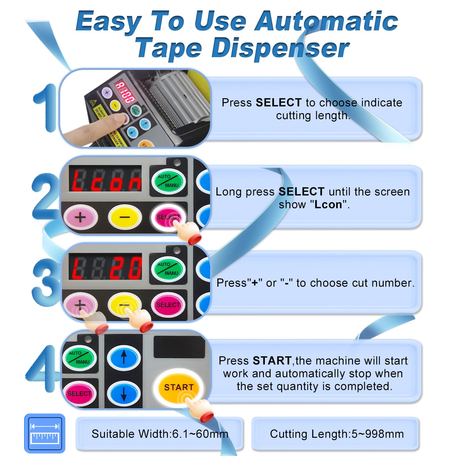 [Intelligent Cutting] Automatic tape dispenser smart sensorcutting, cutting more precise, the cut is smoother. The automatictape dispenser can set 6 different cutting lengths and quantities.and preset cutting times. The ribbon cutter has a memoryfunction and does not need to be set again even if it is restarted.The automatic tape cutting machine can preset the maximumcutting length to 999mm. lf two rolls of tape are cut at the sametime, the sum of the width of the tape must be equal to or within60mm.