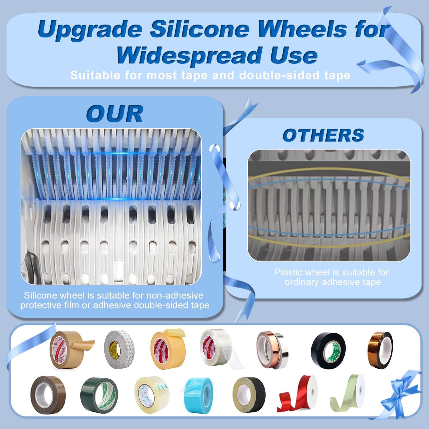 [Wide Range Of Applications] Upgraded the automatic tapedispenser from plastic material to weak sticky silicone material tominimize tape adhesive residue and improve cutting performance.upgrade ribbon cutting machine is suitable for mosttapes, such as ribbon, high temperature tape, transparent tape.double-sided tape, fiber tape, electrical tape, strong tape etc.Theautomatic tape machine is suitable for cutting tapes with a thickness limited to 0.5mm and a width limited to 6-60mm.
