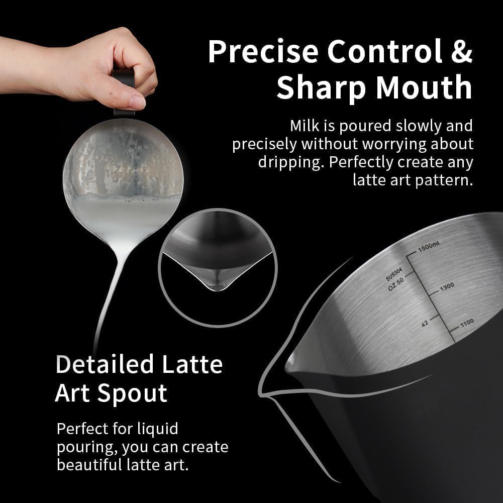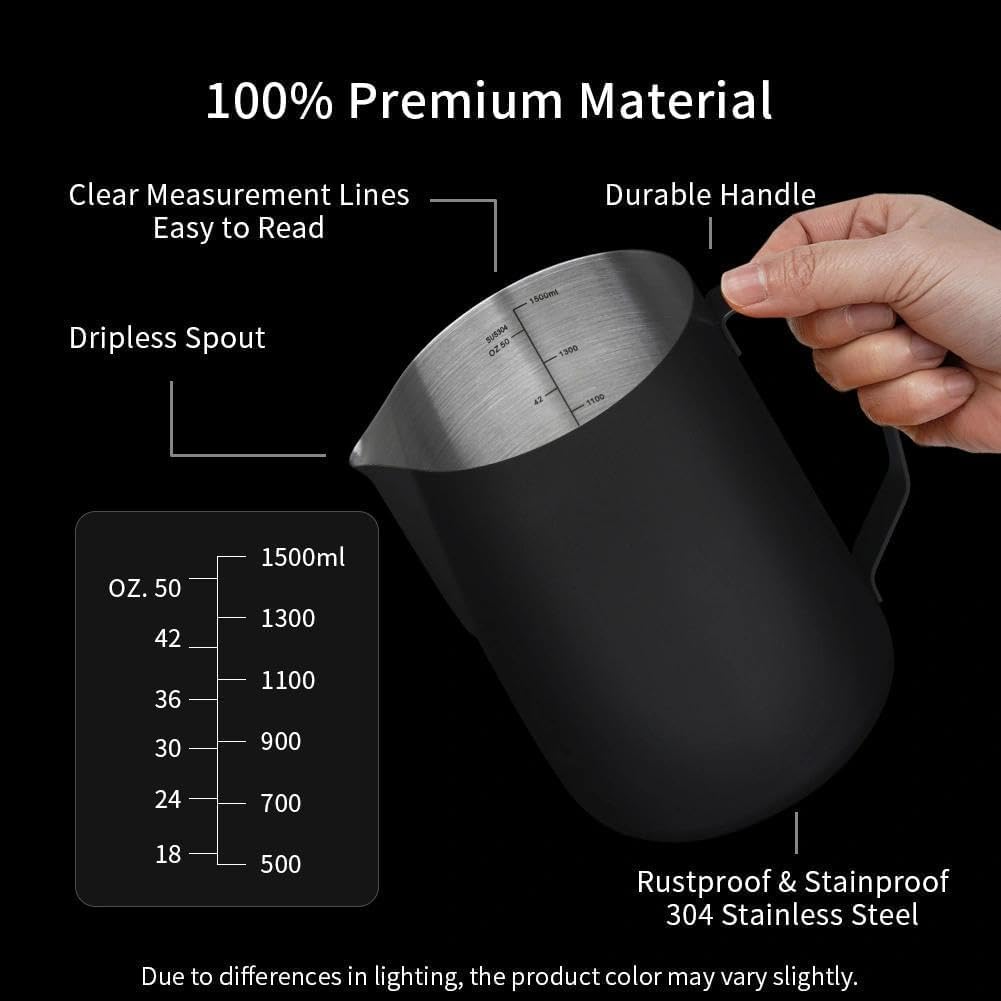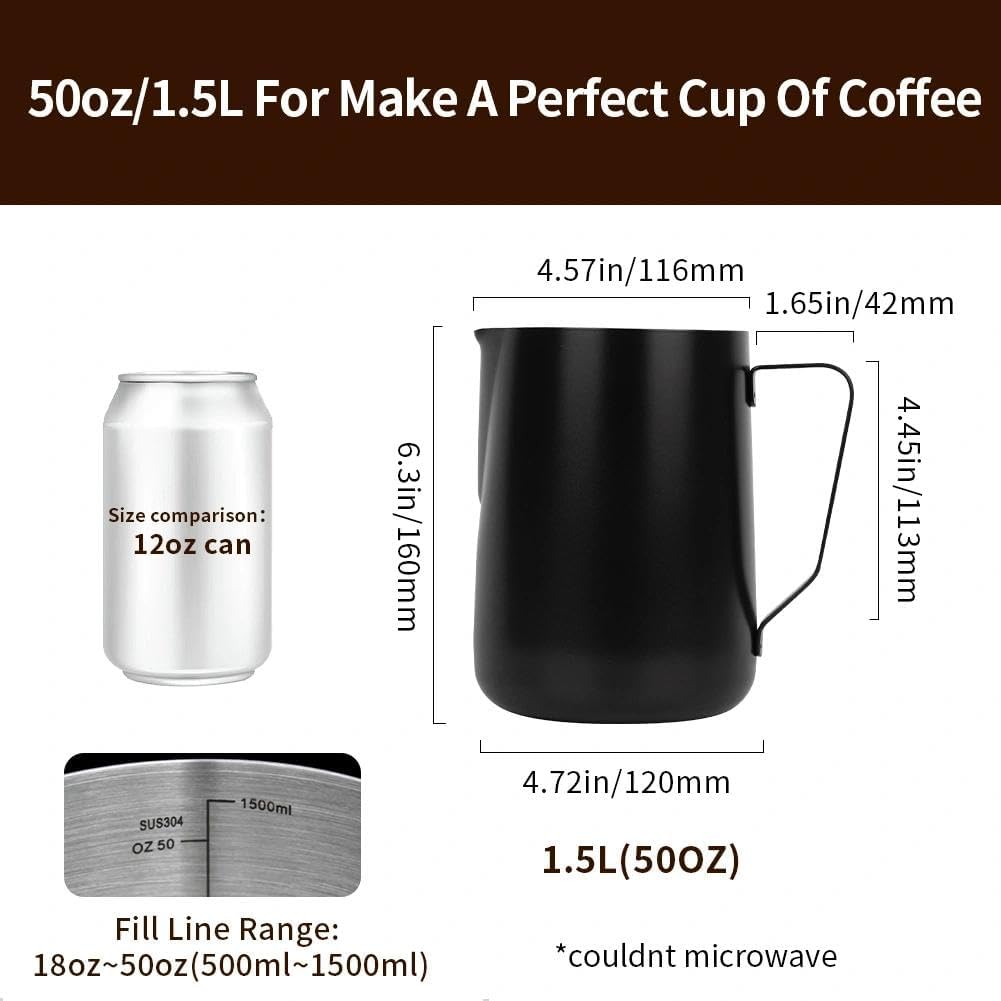 INSIDE SCALE LINES MEASURING: The milk pitcher has clear inside measurement lines(ml/oz), making it easier to control the amount of milk or cream per cup of coffee. 12oz/20oz/32oz/50oz milk frother pitcher can satisfied your different demands. Ideal for foaming or steaming milk, used in espresso and cappuccinos, it can be used for any liquid measuring like water, juices, batter mixes, smoothies etc.