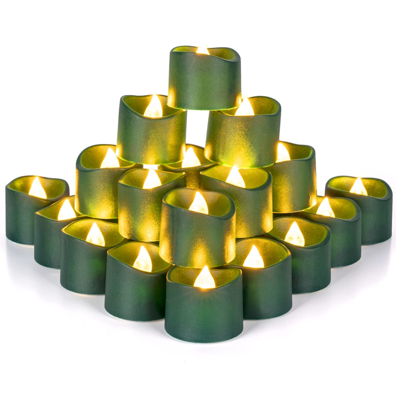 Homemory 24Pcs Green Tea Lights Battery Operated, Green Base Warm White Light, Flameless Flickering Green Candles, Holiday Candles for Christmas, Home Decor, Theme Party