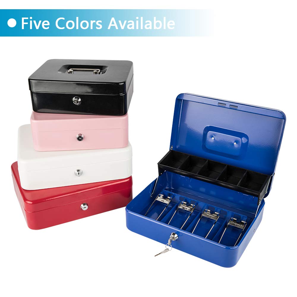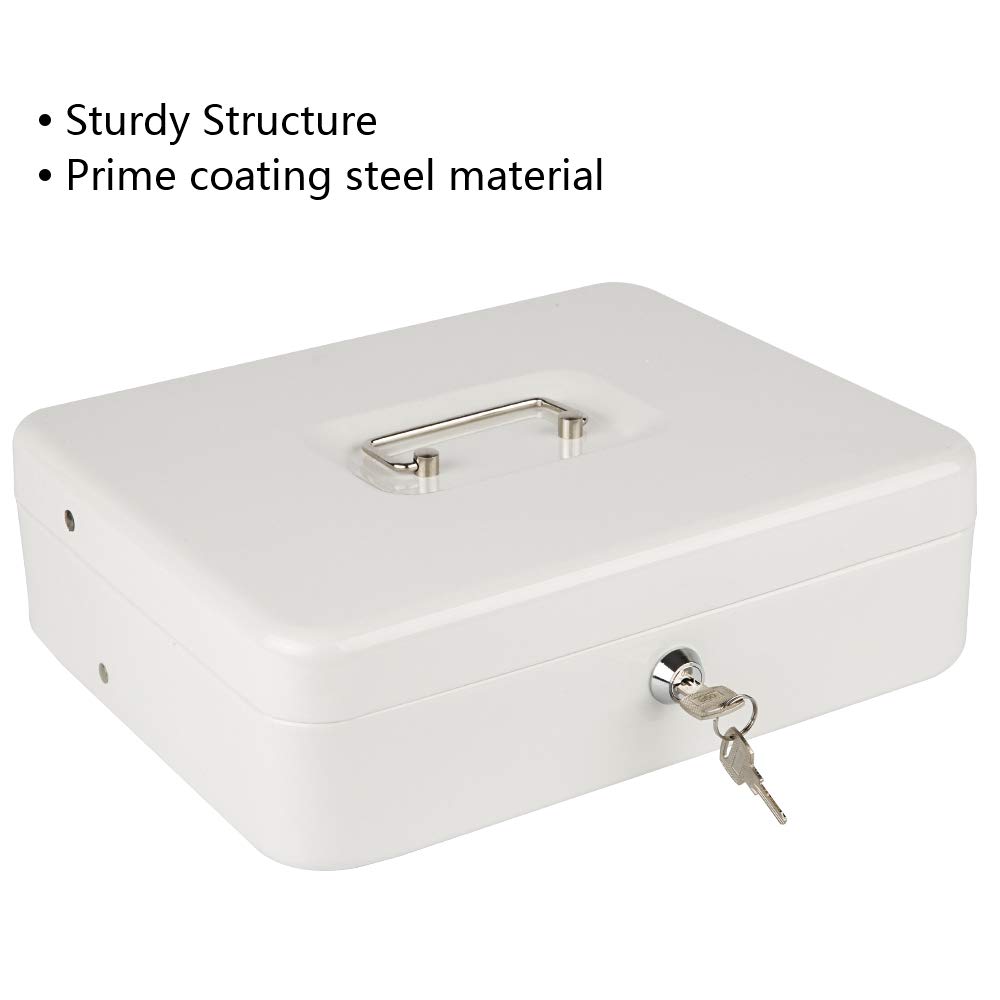 PETTY CASH BOX: This lock boxes is constructed of durable steel which is solidly built and won't simply burst open if dropped.For indoor and outdoor use. Such as School, Supermarket, Storage Lockers, Cabinets, Family, Yard Sale and so on. Suitable to store bills, coins, checks and receipts.