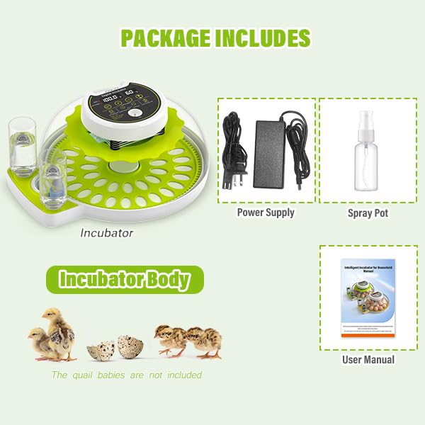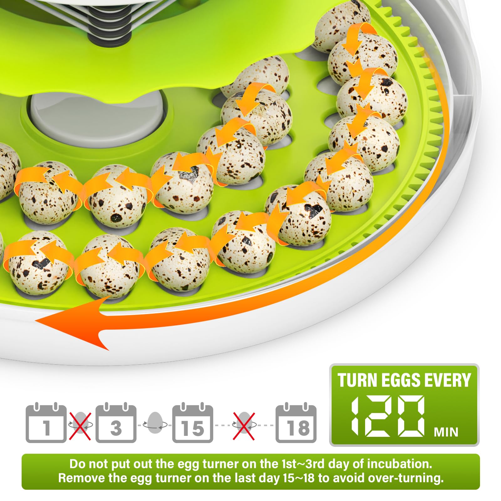 Quail Incubator with Egg Turner: Smart Quail Incubator, which can automatically turn over the incubating quail eggs without opening the lid. Turning the quail eggs prevents the eggshells from sticking to the egg tray, simulating natural quail egg hatching and increasing the hatching rate