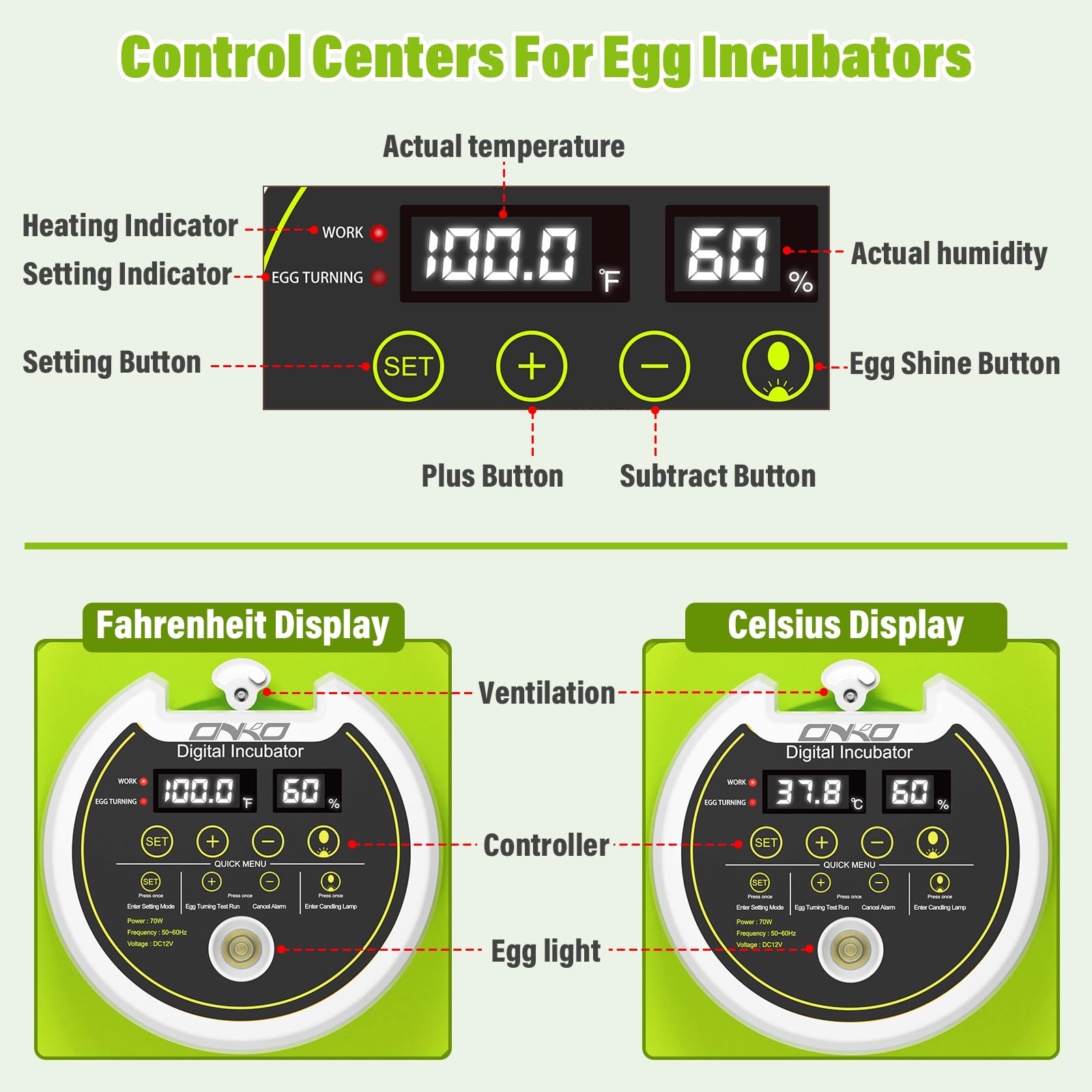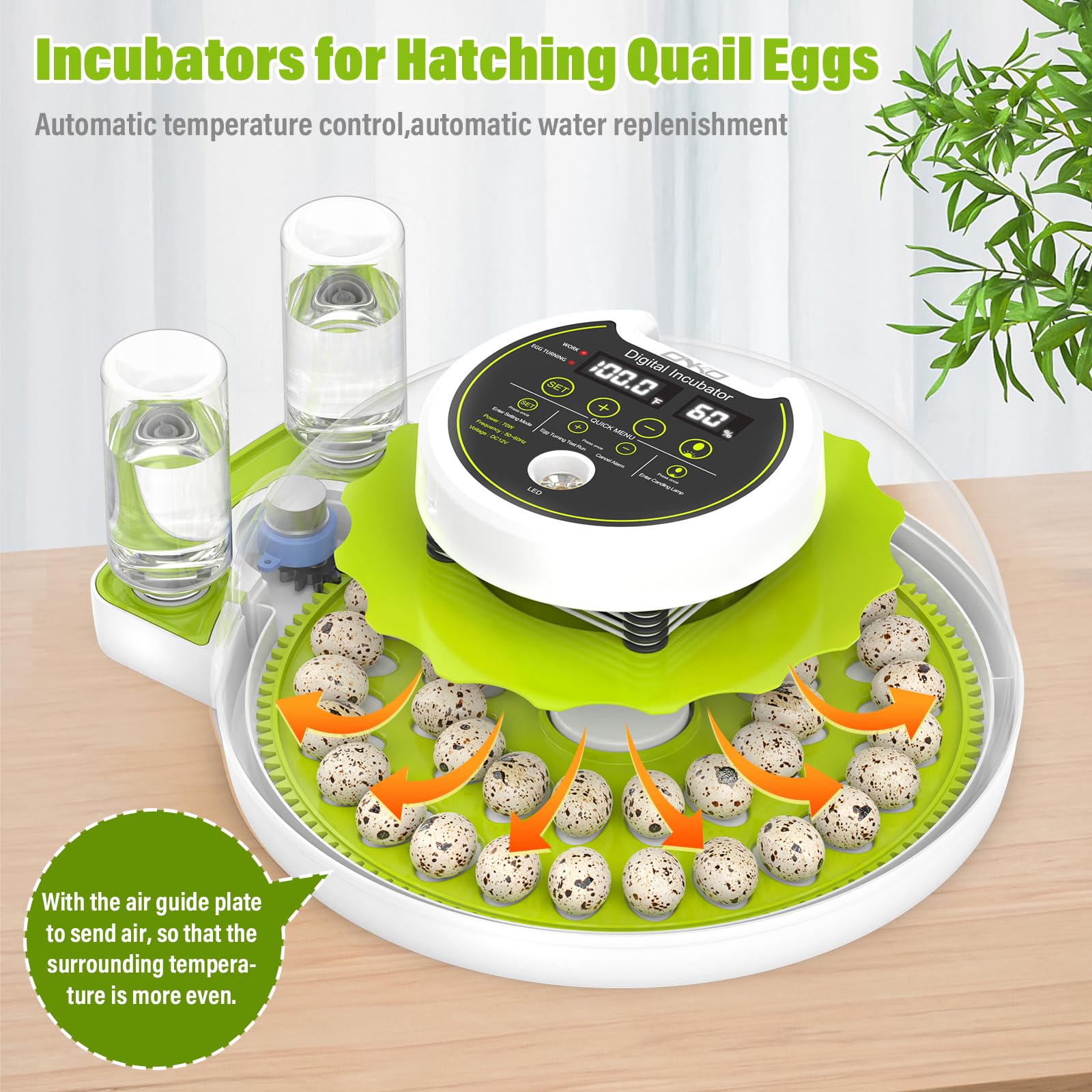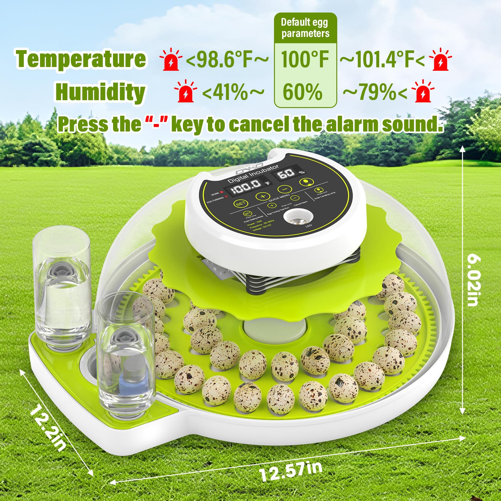 Temperature and Humidity Control: Our quail incubator come with a digital display that shows the current temperature and humidity of the incubator. With our advanced technology, we can automatically heat and humidify the incubator according to the changes in the internal temperature and humidity of the incubator, always keeping the internal temperature and humidity at the most favorable level for hatching