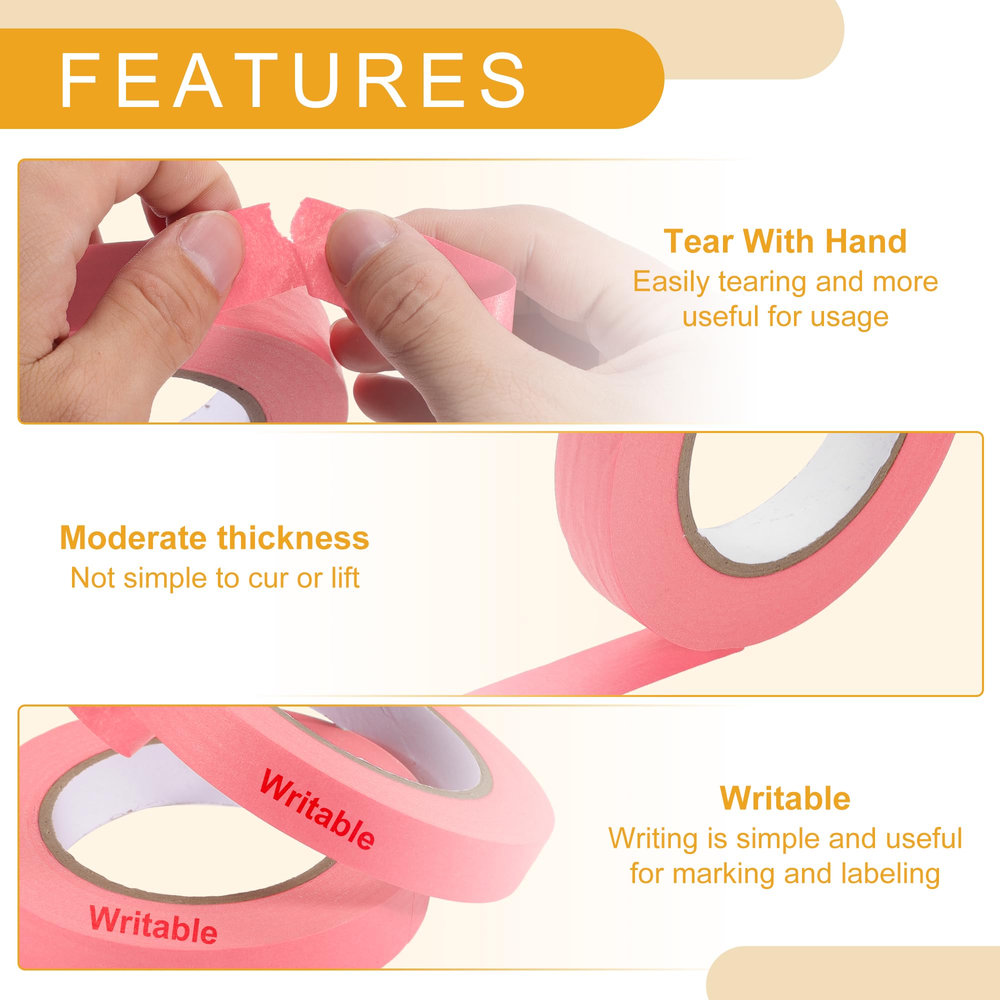 [PRODUCT FUNCTION] The masking tape uses a good glue ratio to achieve the correct viscosity, which can stay indoors for about 14 days, suitable for kinds of surfaces, such as plastic, glass, paper, whiteboard, painted walls, and cars.