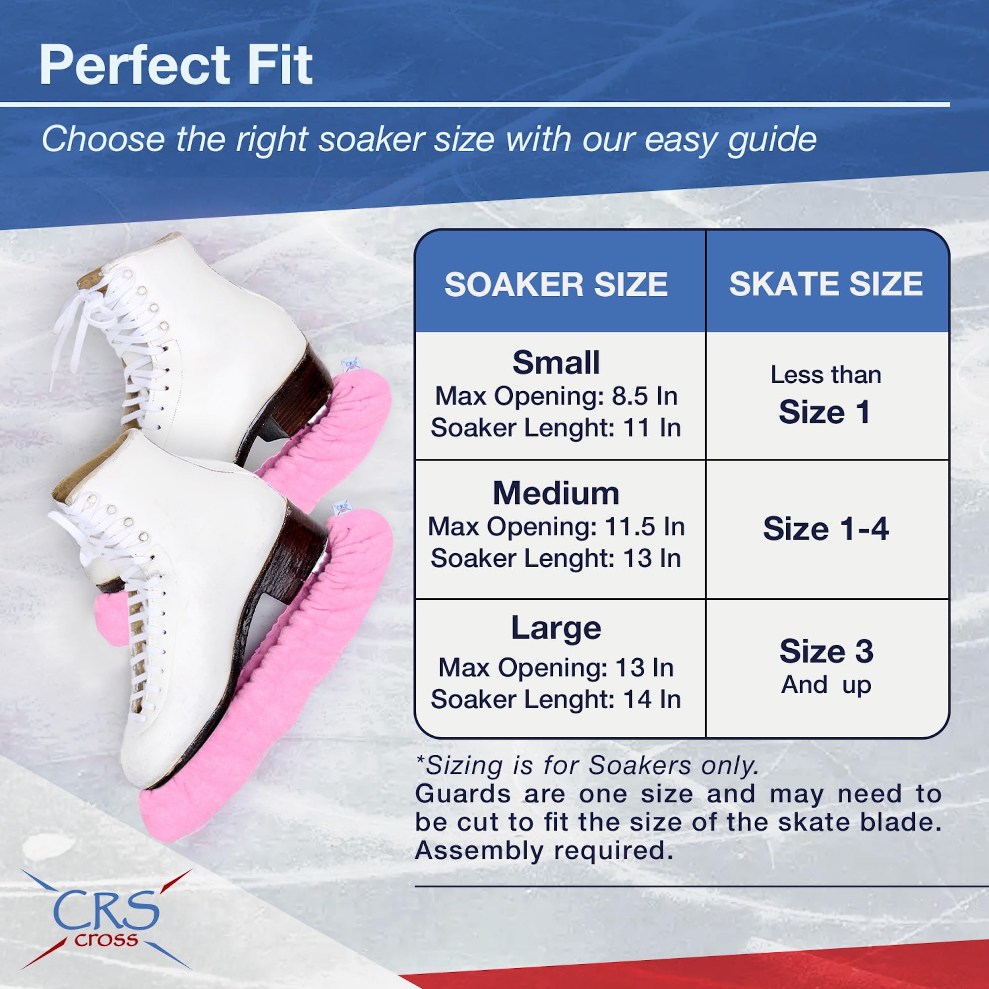 CRS Cross Soakers (also referred to as Soft Guards or Blade Covers) are made from absorbent microfiber to protect and cover ice skate blades. Your skate blades should never be stored in hard guards. Blades should be dried thoroughly the towel and stored in CRS Cross soakers. Three sizes are available based Small, Medium or Large (see size chart according to boot size). Small fits Junior/Youth boot size 1 or smaller, Medium fits adult sizes 1-4, Large fits adult sizes 4+.