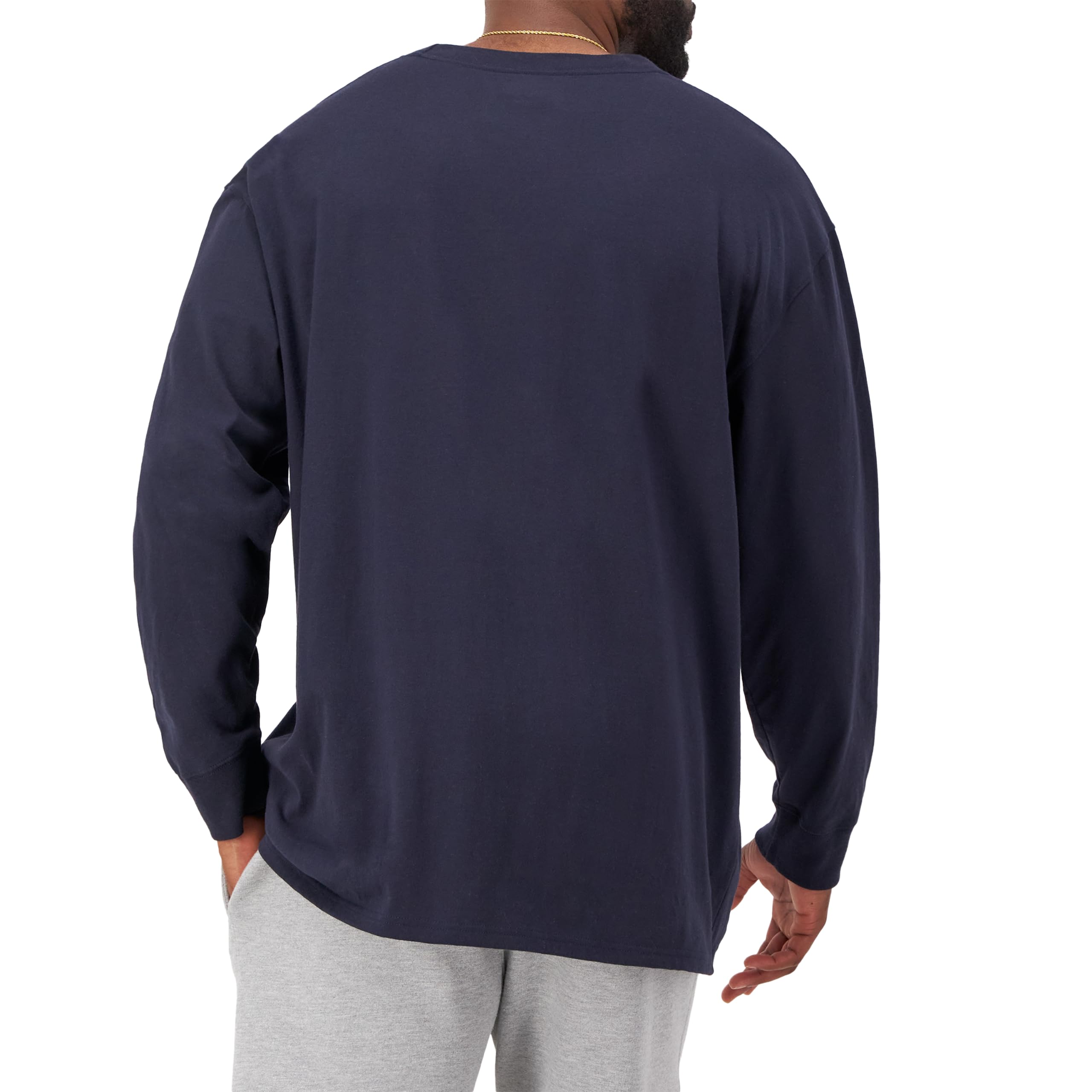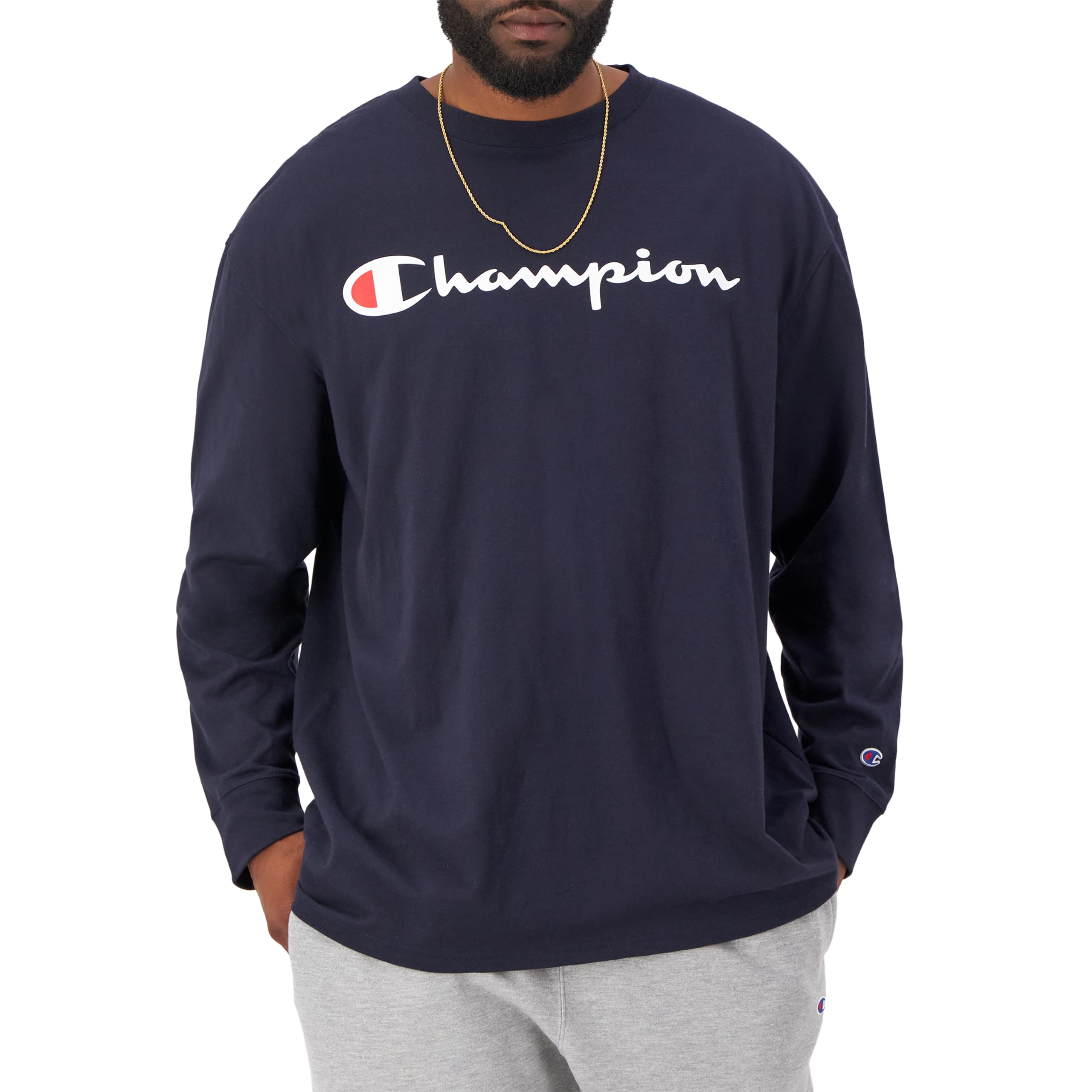 Description A STAPLE FOR ALL SEASONS. A good-to-go long-sleeve shirt is an ideal addition to your year-round wardrobe. Rock this Big & Tall men's long-sleeve T-shirt solo on a breezy night or layer it under your favorite Champion jackets and hoodies for styled warmth. This versatile tee has a soft, worn-in texture you'll love and the cut is made for a Big & Tall frame. The iconic C patch on the chest and sleeve gives that Champion look you trust. From red to black options, there's a look to match your every vibe.