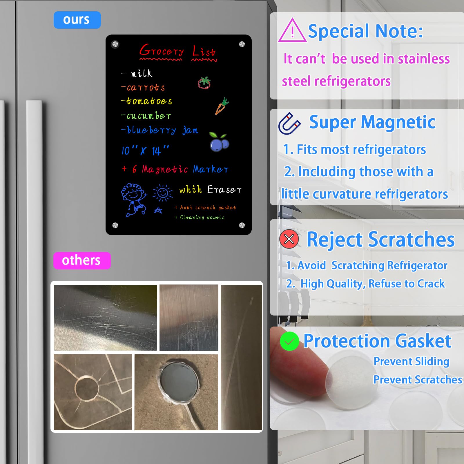 [ Anti-scratch/Anti-sliding ] These 16x12'' acrylic magnetic weekly planning board for fridge will not slide down even when you slam the fridge door.It includes protective pads incase your fridge isn't magnetic and/ to prevent scratches. They also do not scratch your fridge. (But these weekly black board are not suitable for stainless steel fridge or curved fridge/refrigerator.)