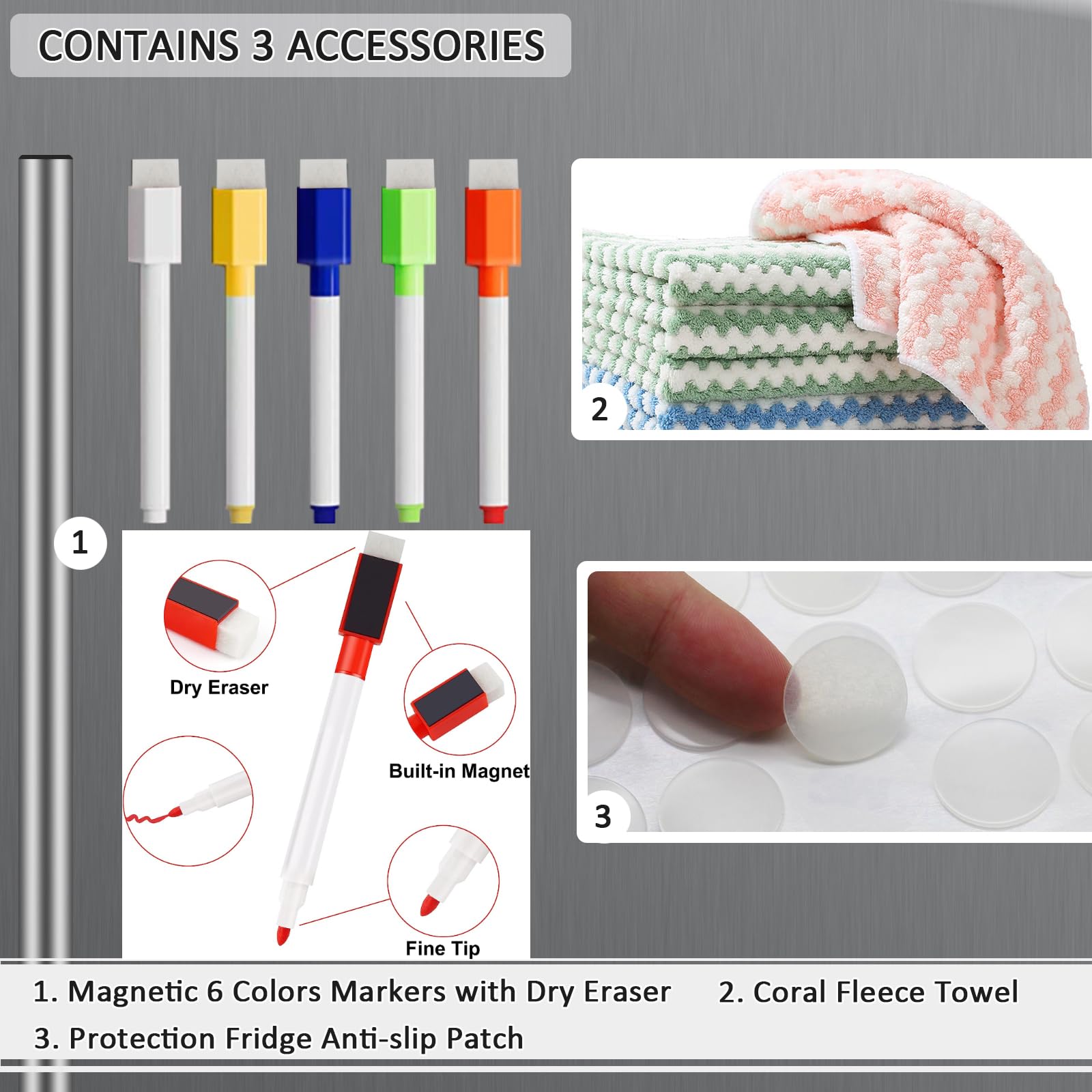 [ Dry Erase Calendar Set ] This fridge calendar set contains of 4 kinds products,10‘’ x 14’’ magnetic acrylic dry erase board,different colors markers * 6 , protection fridge anti-slip patch, clean towel. The kit is more convenient to use.Not only is there a high end finish to the dry erase calendar and board.The black magnetic acrylic board,especially suitable for decorating on white and black refrigerator doors.