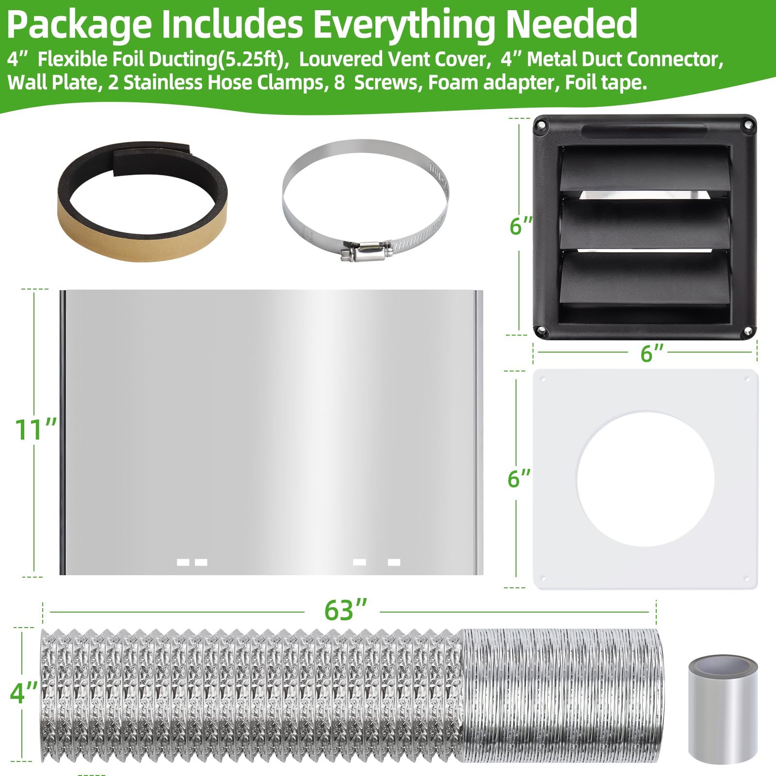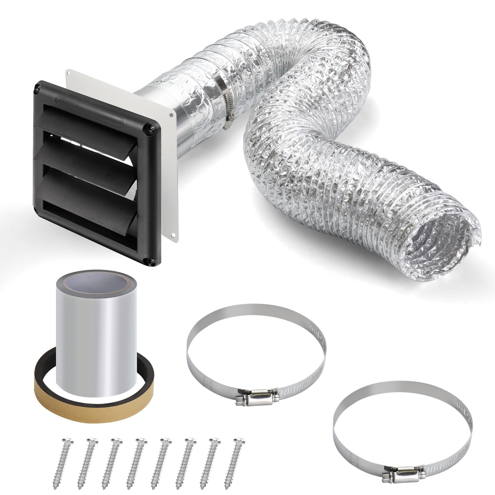 Package includes: Our 4 inches dryer vent kit through wall package includes everything needed to replace the exhaust fan's ducting---- 4” flexible dryer vent hose(Max 63”), 6" x 6" black louvered vent cover, 11” long 4” diameter metal duct connector, dryer vent wall plate, 2 stainless steel hose clamp, foam adapter, 8 mounting screws, foil tape.